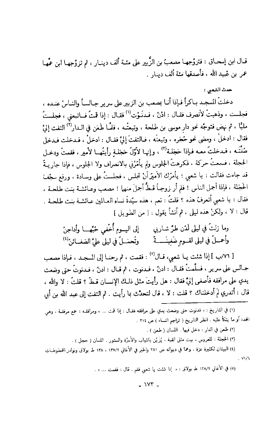 حد الشعبي: دخلت المسجد باكراً فإذا أنا بمصعب بن الزبير على سرير جالساً والناس عنده، فجلست، وذهبت لأنصرف فقال: ادن، فدنوت فقال: إذا قمت فاتبعني، فجلست مليا، ثم نهض فتوجه نحو دار موسى بن طلحة، وتبعته، فلما طعن في الدار التفت إلي فقال: ادخل، ومضى نحو حجره، وتبعته، فالفت إلي فقال: ادخل، فدخلت فدخل صفته، فدخلت معه فإذا حجلة، وإنها لأول حجلةٍ رأيتها لأمير، فقمت ودخل الحجلة، فسمعت حركة، فكرهت الجلوس ولم يأمرني بالانصراف ولا الجلوس، فإذا جاريةً قد جاءت فقالت: يا شعبي؛ يأمرك الأمير أن تجلس، فجلست على وسادة، ورفع سجف الحجلة، فإذا أجمل الناس! فلم أر زوجاً قط أجمل منهما! مصعب وعائشة بنت طلحة، فقال: يا شعبي أتعرف هذه؟ قلت: نعم، هذه سيدة نساء العالمين عائشة بنت طلحة. قال: لا، ولكن هذه ليلى، ثم أنشأ يقول: من الطويل