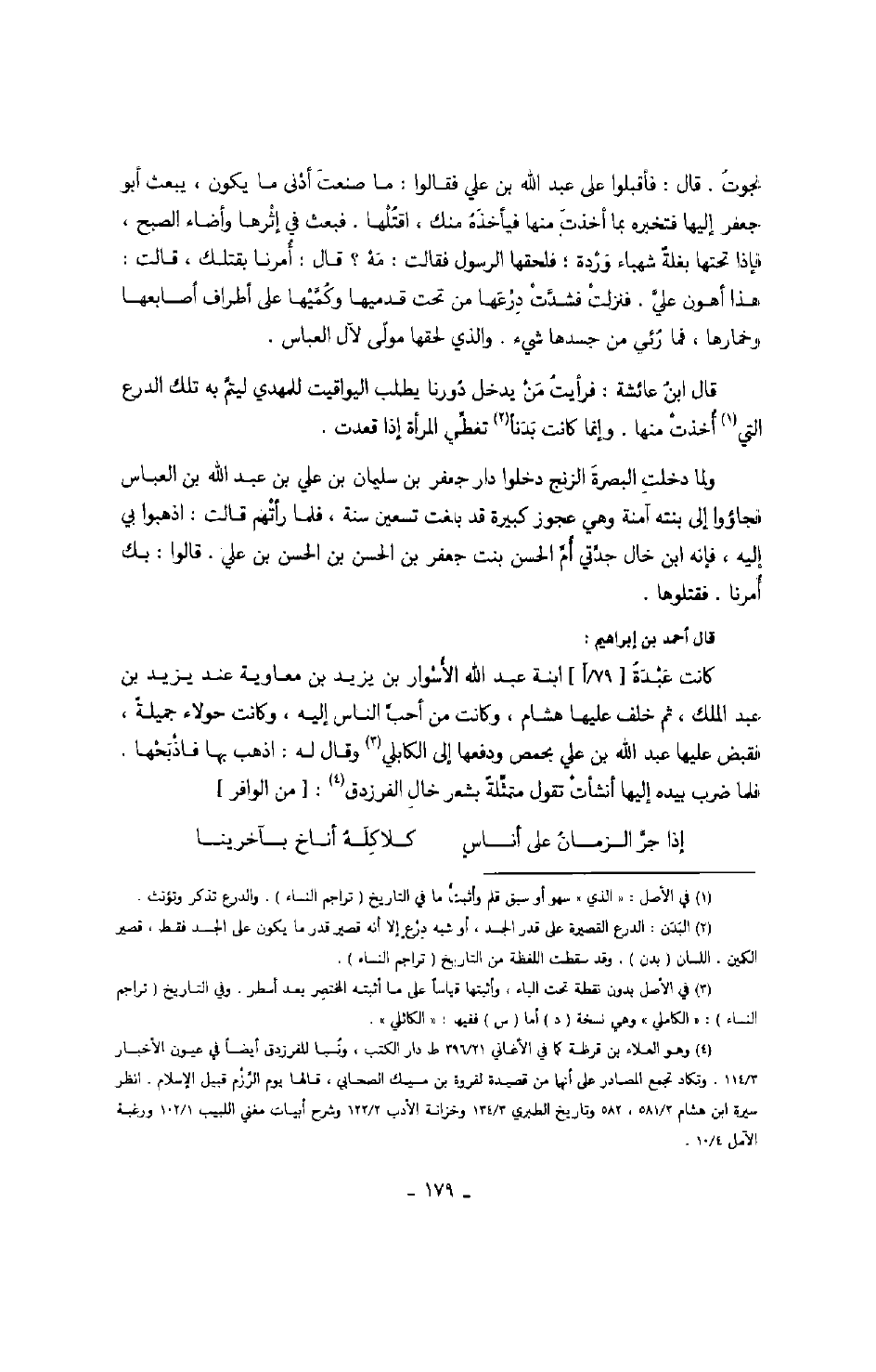 قال أحمد بن إبراهيم: كانت عبدة ابنة عبد الله الأسوار بن يزيد بن معاوية عند يزيد بن عبد الملك، ثم خلف عليها هشام، وكانت من أحب الناس إليه، وكانت حولاء جميلةٌ، فقبض عليها عبد الله بن علي بحمص ودفعها إلى الكابلي وقال له: اذهب بها فاذبحها. فلما ضرب بيده إليها أنشأت تقول متمثلةً بشعر خال الفرزدق: من الوافر