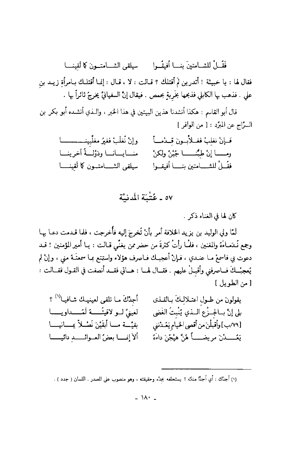 قال أبو القاسم: هكذا أنشدنا هذين البيتين في هذا الخبر، والذي أنشده أبو بكر بن السراج عن المرد: من الوافر