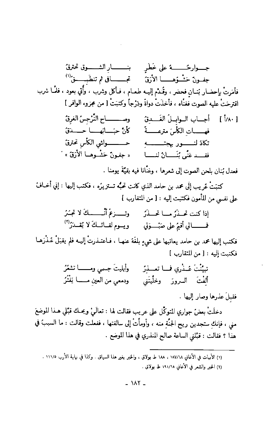 فأمرت بإحضار بنانٍ فحضر، وقدم إليه طعام، فأكل وشرب، وأتي بعود، فلما شرب اقترحت عليه الصوت فغناه، فأخذت دواةٌ ودرجاً وكتبت من مجزوء الوافر
