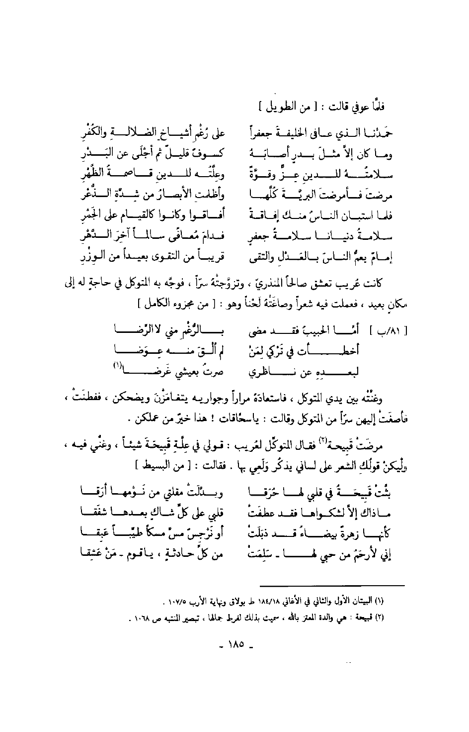 مرضت قبيحة فقال المتوكل لعريب: قولي في علة قبيحة شيئاً، وغني فيه، وليكن قولك الشعر على لساني يذكر ولعي بها. فقالت: من البسيط