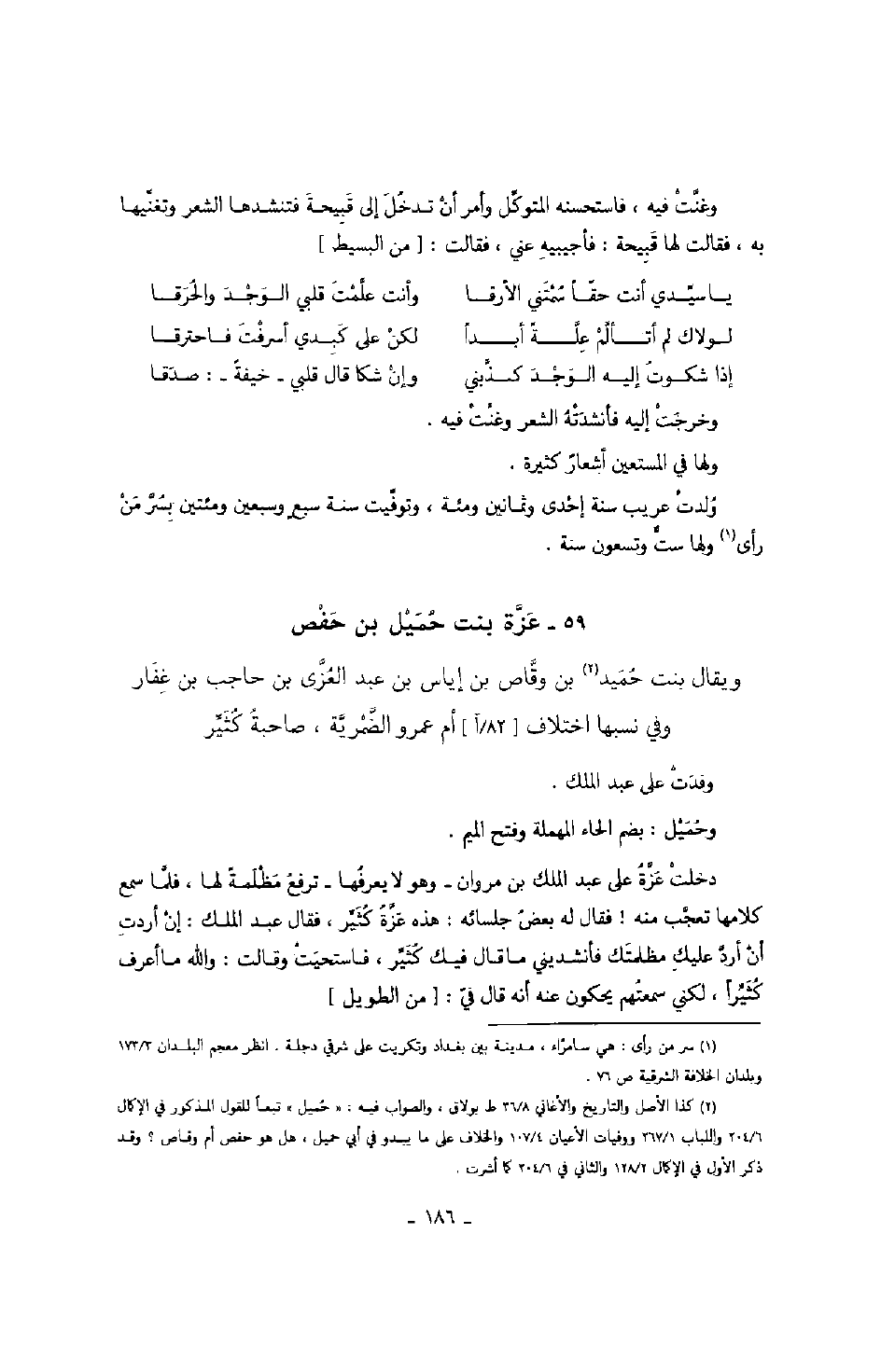 وغنت فيه، فاستحسنه المتوكل وأمر أن تدخل إلى قبيحة فتنشدها الشعر وتغنيها به، فقالت لها قبيحة: فأجيبيه عني، فقالت: من البسيط