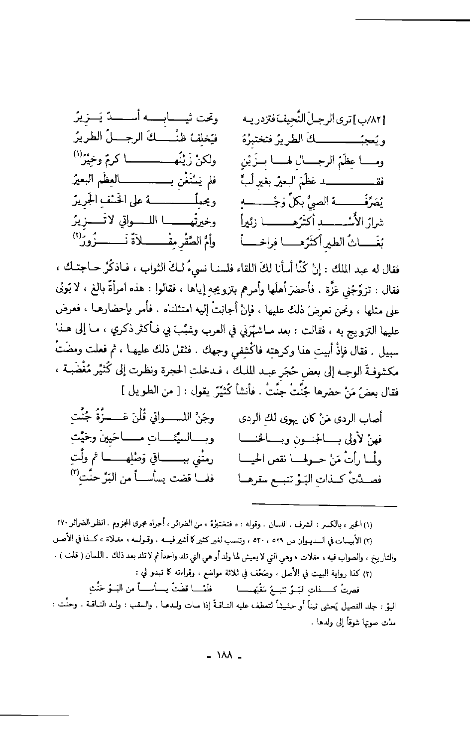 فقال له عبد الملك: إن كنا أسأنا لك اللقاء فلسنا نسيء لك الثواب، فاذكر حاجتك، فقال: تزوجني عزة. فأحضر أهلها وأمرهم بتزويجه إياها، فقالوا: هذه امرأة بالغ، فعرض عليها التزويج به، فقالت: بعد ما شهرني في العرب وشبب بي فأكثر ذكري، ما إلى هذا سبيل. فقال فإذ أبيت هذا وكرهته فاكشفي وجهك. فثقل ذلك عليها، ثم فعلت ومضت مكشوفة الوجه إلى بعض حجر عبد الملك، فدخلت الحجرة ونظرت إلى كثير مغضبة، فقال بعض من حضرها جنت جنت. فأنشأ كثير يقول: من الطويل