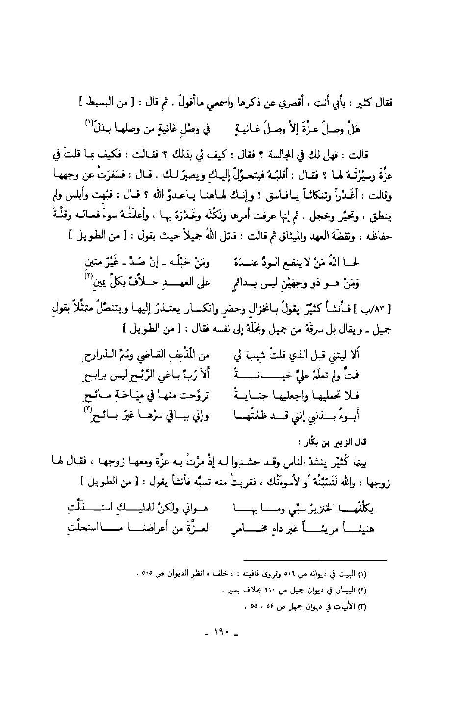 فقال كثير: بأبي أنت، أقصري عن ذكرها واسمعي ما أقول. ثم قال: من البسيط