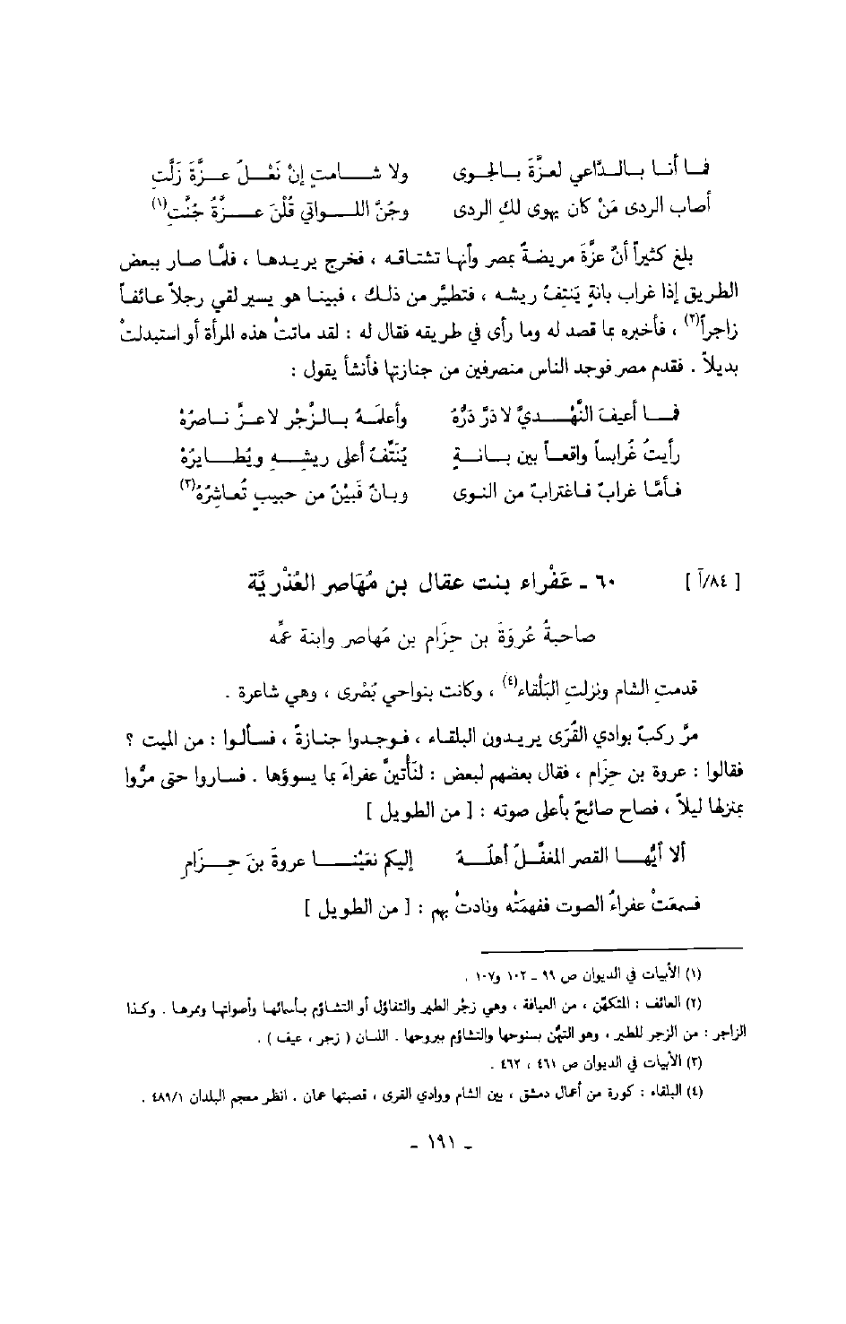 صاحبة عروة بن حزام بن مهاصر وابنة عمه قدمت الشام ونزلت البلقاء، وكانت بنواحي بصرى، وهي شاعرة.