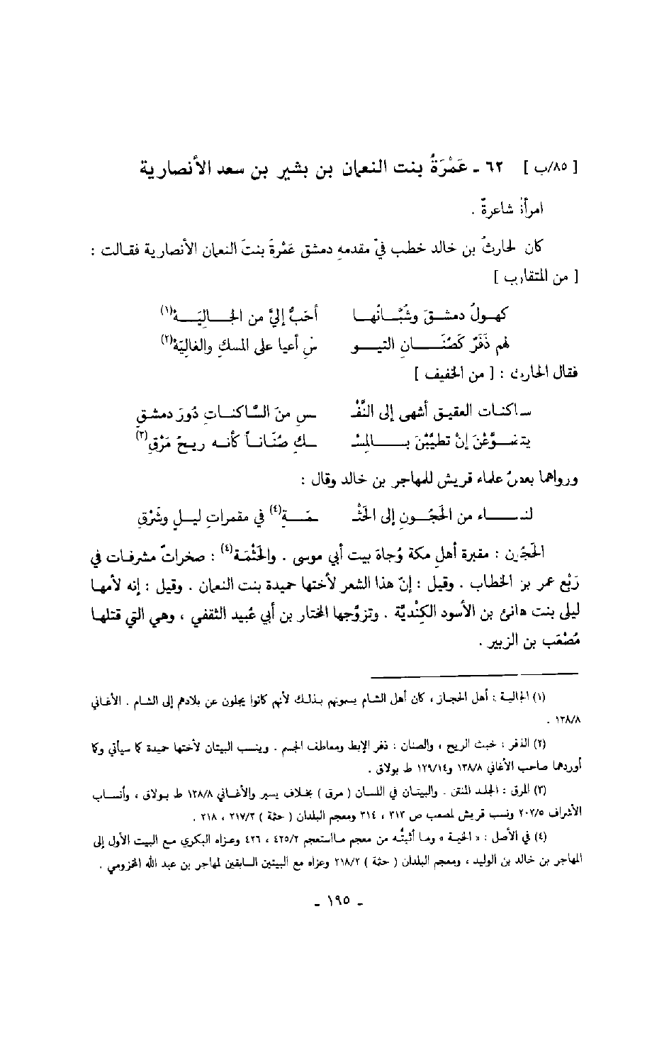 كان الحارث بن خالد خطب في مقدمه دمشق عمرة بنت النعمان الأنصارية فقالت: من المتقارب