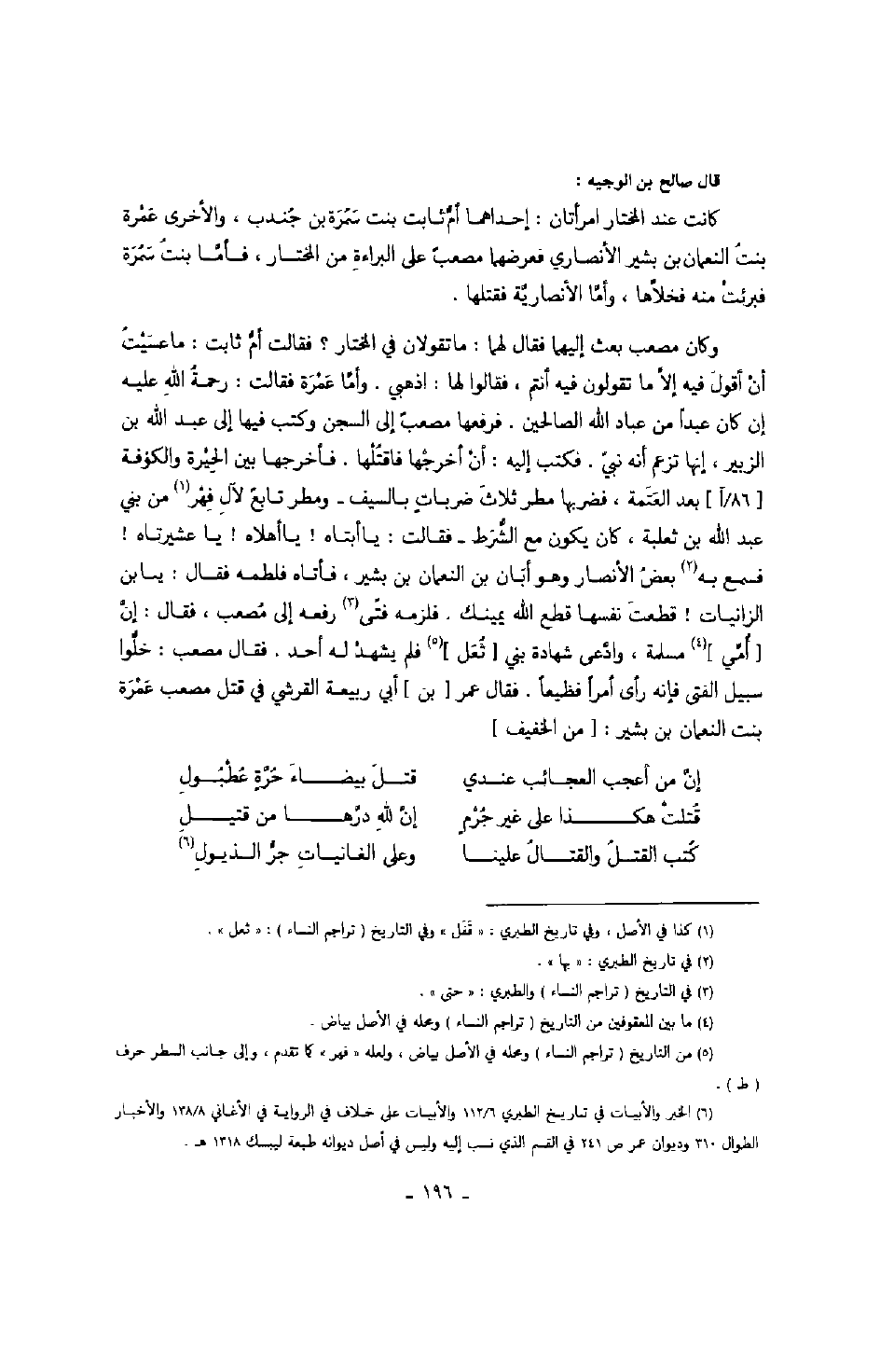 وكان مصعب بعث إليهما فقال لهما: ما تقولان في المختار؟ فقالت أم ثابت: ما عسيب أن أقول فيه إلا ما تقولون فيه أنت، فقالوا لها: اذهبي. وأما عمرة فقالت: رحمة الله عليه إن كان عبداً من عباد الله الصالحين. فرفعها مصعبٌ إلى السجن وكتب فيها إلى عبد الله بن الزبير، إنها تزعم أنه نبي. فكتب إليه: أن أخرجها فاقتلها. فأخرجها بين الحيرة والكوفة بعد العتمة، فضربها مطر ثلاث ضرباتٍ بالسيف - ومطر تابع لآل فهر من بني عبد الله بن ثعلبة، كان يكون مع الشرط - فقالت: يا أبتاه! يا أهلاه! يا عشيرتاه! فسمع به بعض الأنصار وهو أبان بن النعمان بن بشير، فأتاه فلطمه فقال: يا بن الزانيات! قدعت نفسها قطع الله يمينك. فلزمه فتى رفعه إلى مصعب، فقال: إن أمي مسلمة، وادعى شهادة بني ثعل فلم يشهد له أحد. فقال مصعب: خلوا سبيل الفتي فإنه رأى أمراً فظيعاً. فقال عمر بن أبي ربيعة القرشي في قتل مصعب عمرة بنت النعمان بن بشير: من الخفيف