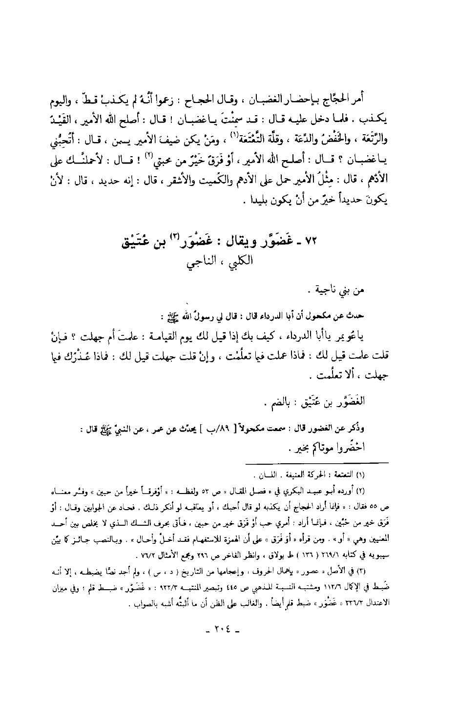 أمر الحجاج بإحضار الغضبان، وقال الحجاج: زعموا أنه لم يكذب قط، واليوم يكذب. فلما دخل عليه قال: قد سمنت يا غضبان! قال: أصلح الله الأمير، القيد والرتعة، والخفض والدغة، وقلة التعتعة، ومن يكن ضيف الأمير يسمن، قال: أتحبني يا غذبان؟ قال: أصلح الله الأمير، أو فرقٌ خيرٌ من محبتي! قال: لأحملنك على الأدهم، قال: مثل الأمير حمل على الأدهم والكميت والأشقر، قال: إنه حديد، قال: لأن يكون حديداً خيرٌ من أن يكون بليداً.