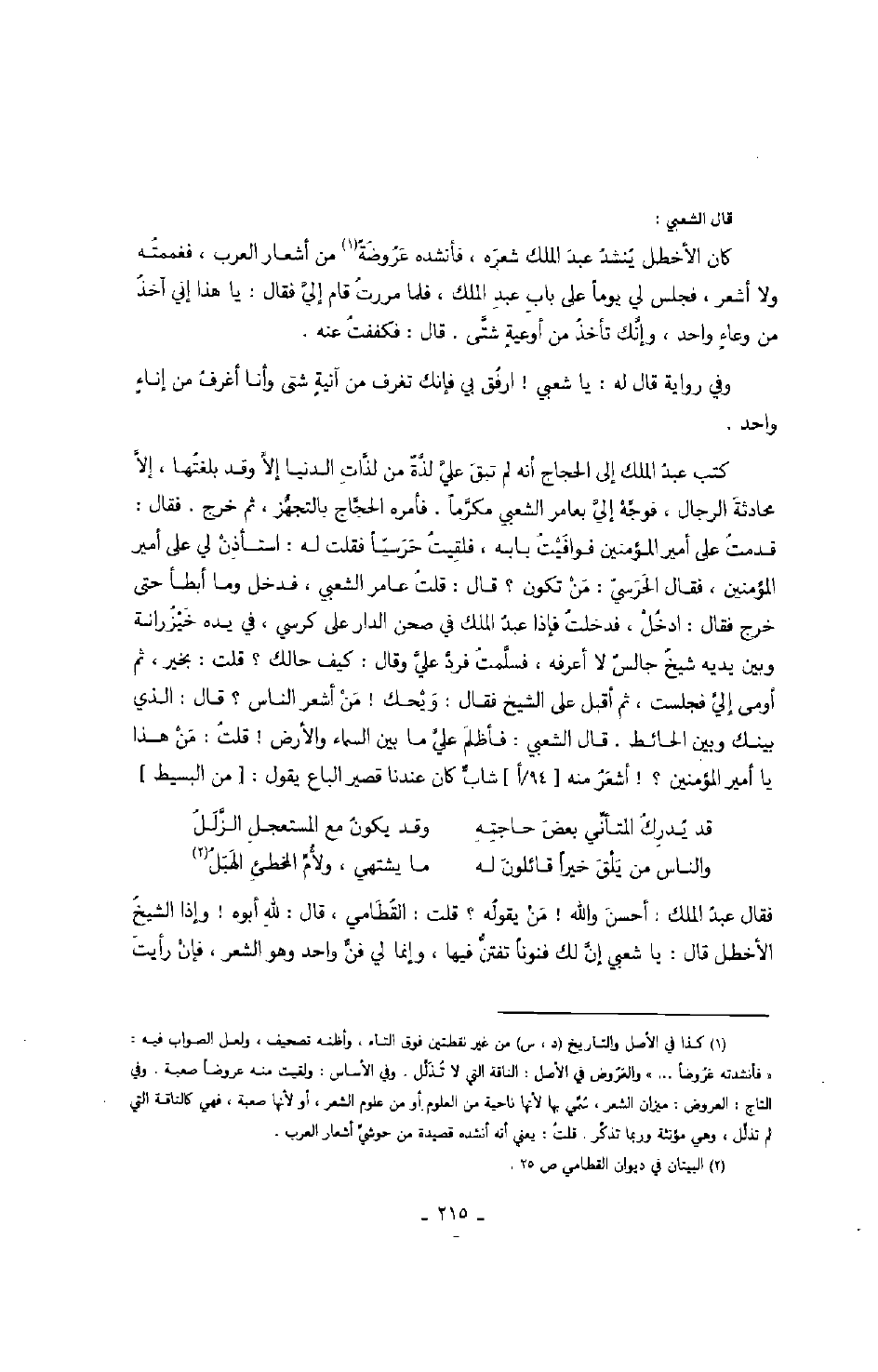 فقال عبد الملك: أحسن والله! من يقوله؟ قلت: القطامي، قال: لله أبوه! وإذا الشيخ الأخطل قال: يا شعبي إن لك فنوناً تفتن فيها، وإنما لي فن واحد وهو الشعر، فإن رأيت