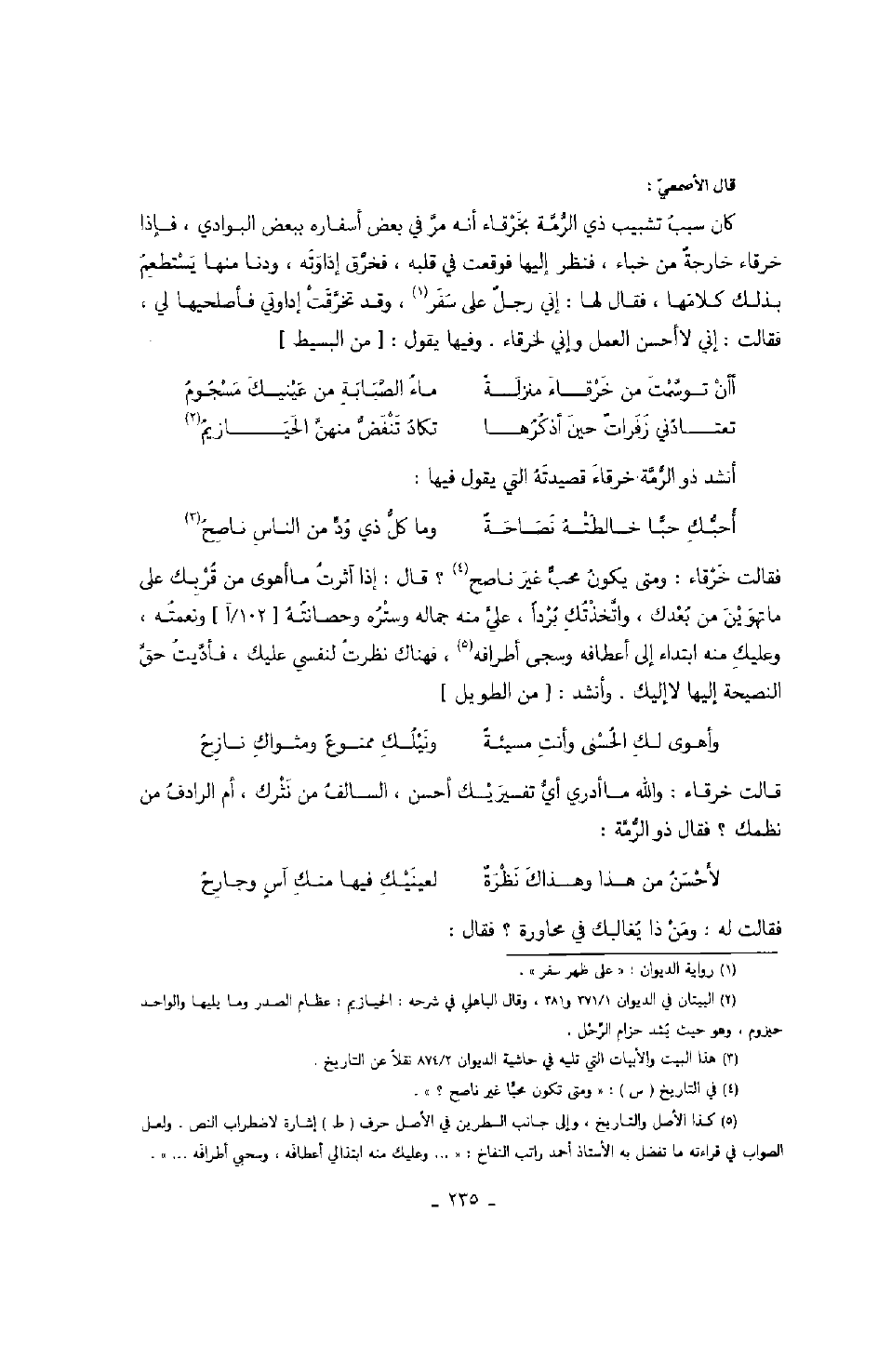 قالت خرقاء: والله ما ادري أي تفسير أحسن، السالف من نثرك، أم الرادف من نظمك؟ فقال ذو الرمة: