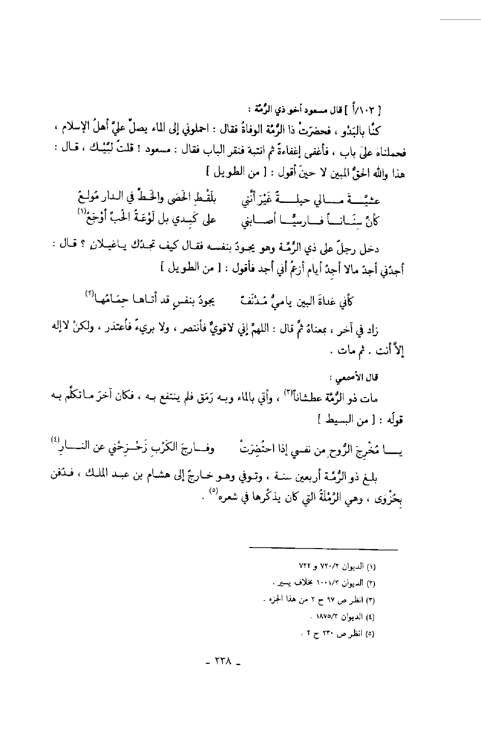قال الأصمعي: مات ذو الرمة عطشاناً، وأتى بالماء وبه رمق فلم ينتفع به، فكان آخر ما تكلم به قوله: من البسيط