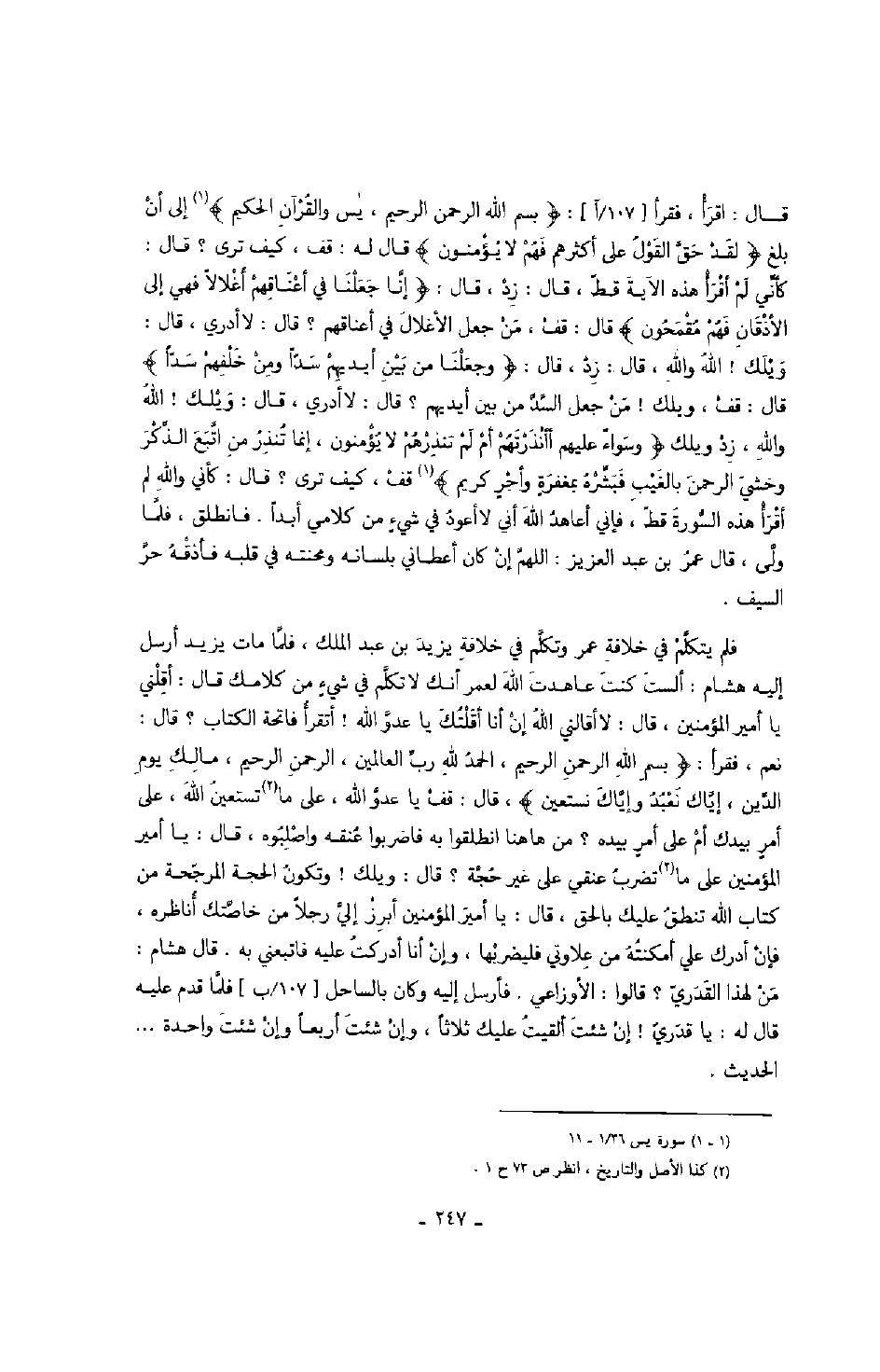 فلم يتكلم في خلافة عمر وتكلم في خلافة يزيد بن عبد الملك، فلما مات يزيد أرسل إليه هشام: ألست كنت عاهدت الله لعمر أنك لا تكلم في شيءٍ من كلامك قال: أقلني يا أمير المؤمنين، قال: لا أقالني الله إن أنا أقلتك يا عدو الله! أتقرأ فاتحة الكتاب؟ قال: نعم، فقرأ: " بسم الله الرحمن الرحيم، الحمد لله رب العالمين، الرحمن الرحيم، مالك يوم الدين، إياك نعبد وإياك نستعين "، قال: قف يا عدو الله، على ما تستعين الله، على أمرٍ بيدك أم على أمرٍ بيده؟ من هاهنا انطلقوا به فاضربوا عنقه واصلبوه، قال: يا أمير المؤمنين على ما تضرب عنقي على غير حجة؟ قال: ويلك! وتكون الحجة المرجح من كتاب الله تنطق عليك بالحق، قال: يا أمير المؤمنين أبرز إلي رجلاً من خاصتك أناظره، فإن أدرك علي أمكنته من علاوتي فليضربها، وإن أنا أدركت عليه فاتبعني به. قال هشام: من لهذا القدري؟ قالوا: الأوزاعي. فأرسل إليه وكان بالساحل فلما قدم عليه قال له: يا قدري! إن شئت ألقيت عليك ثلاثاً، وإن شئت أربعاً وإن شئت واحدة ... الحديث.
