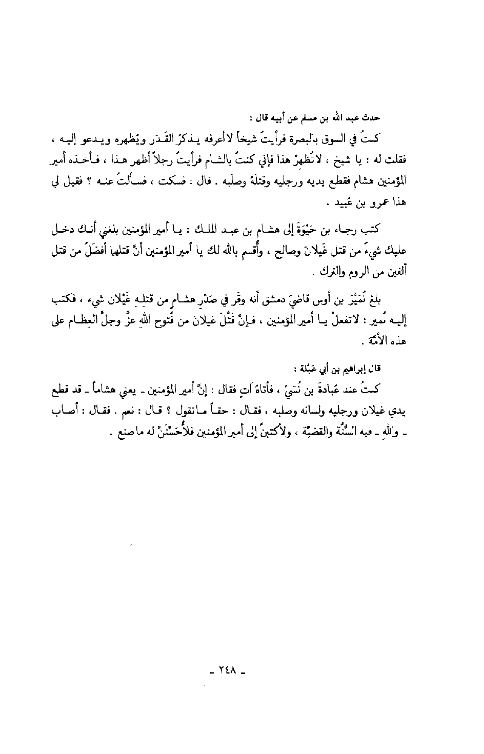 حدث عبد الله بن مسلم عن أبيه قال: كنت في السوق بالبصرة فرأيت شيخاً لا أعرفه يذكر القدر ويظهره ويدعو إليه، فقلت له: يا شيخ، لا تظهر هذا فإني كنت بالشام فرأيت رجلاً أظهر هذا، فأخذه أمير المؤمنين هشام فقطع يديه ورجليه وقتله وصلبه. قال: فسكت، فسألت عنه؟ فقيل لي هذا عمرو بن عبيد.