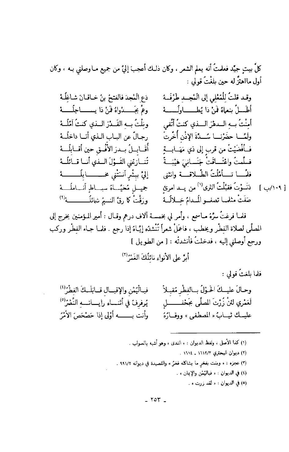 فلما فرغت سره ما سمع، وأمر لي بخمسة آلاف درهم وقال: أمير المؤمنين يخرج إلى المصلى الفطر ويخطب، فاعمل شعراً تنشده إياه إذا رجع. فلما جاء الفطر وركب ورجع أوصلني إليه، فدخلت فأنشدته: من الطويل فلما بلغت قولي: