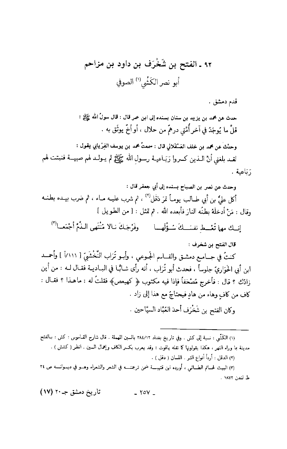 قال الفتح بن شخرف: كنت في جامع دمشق والقاسم الجوعي، وأبو تراب النخشبي وأحمد ابن أبي الحواري جلوساً، فحدث أبو تراب، أنه رأى شابا في البادية فقال له: من أين زاد؟ قال: فأخرج مصحفاً فإذا فيه مكتوب " كهيعص " فقلت له: ما هذا؟ فقال: كاف من كافٍ وهاء من هادٍ فيحتاج مع هذا إلى زاد.