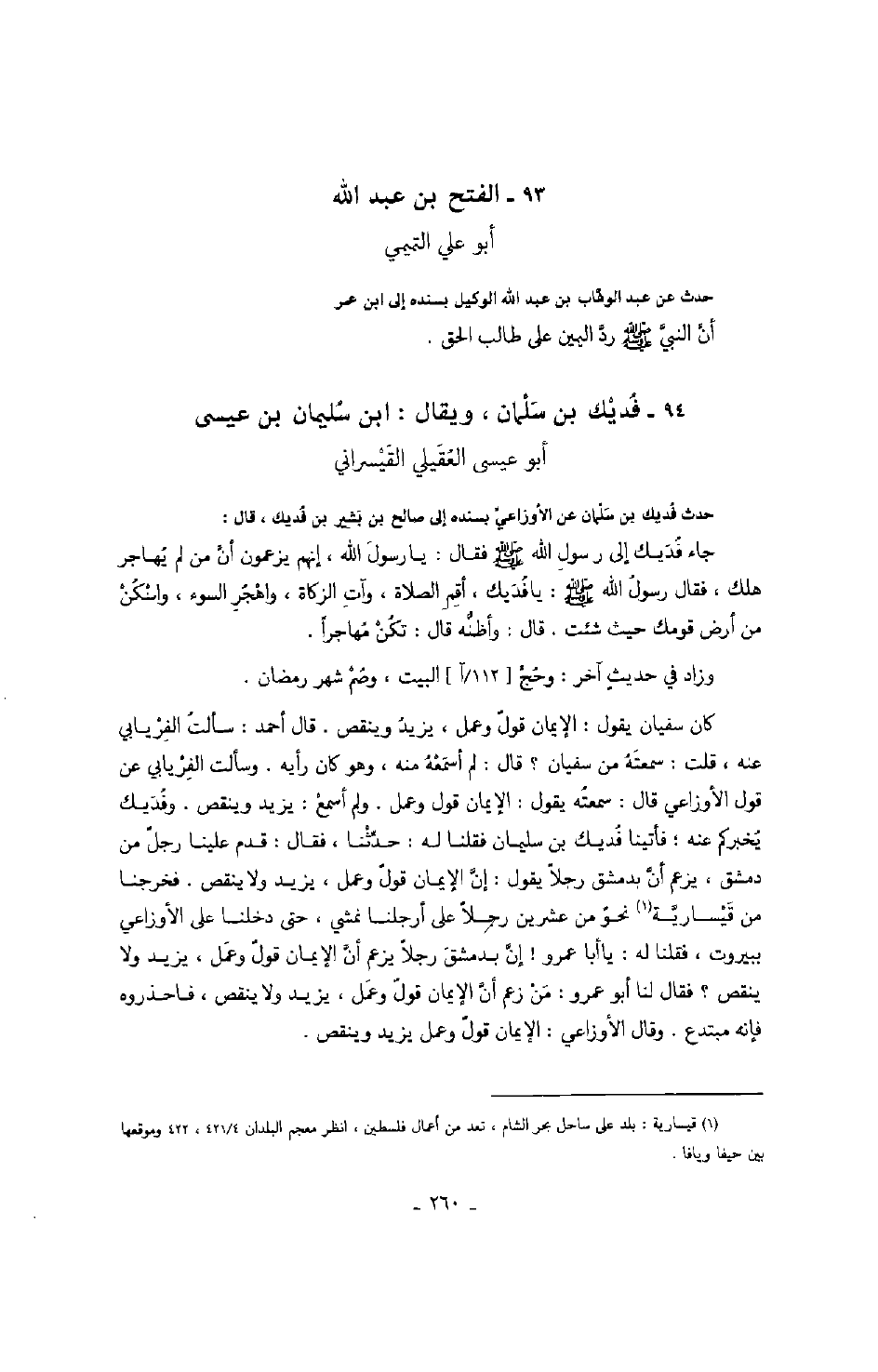 كان سفيان يقول: الإيمان قولٌ وعمل، يزيد وينقص. قال أحمد: سألت الفريابي عنه، قلت: سمعته من سفيان؟ قال: لم أسمعه منه، وهو كان رأيه. وسألت الفريابي عن قول الأوزاعي قال: سمعته يقول: الإيمان قولٌ وعمل، ولم أسمع: يزيد وينقص. وفديك يخبركم عنه؛ فأتينا فديك بن سليمان فقلنا له: حدثنا، فقال: قدم علينا رجلٌ من دمشق، يزعم أن بدمشق رجلاً يقول: إن الإيمان قولٌ وعمل، يزيد وينقص. فخرجنا من قيسارية نحو من عشرين رجلاً يزعم أن الإيمان قولٌ وعمل، يزيد ولا ينقص؟ فقال لنا أبو عمرو: من زعم أن الإيمان قولٌ وعمل، يزيد ولا ينقص، فاحذروه فإنه مبتدع. وقال الأوزاعي: الإيمان قولٌ وعمل، يزيد وينقص.