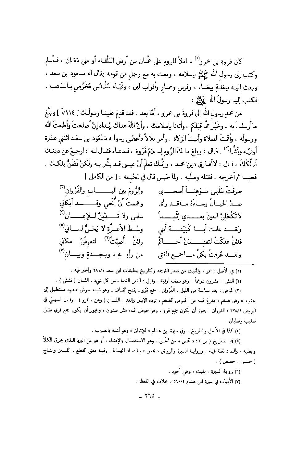 كان فروة بن عمرو عاملاً للروم على عمان من أرض البلقاء أو على معان، فأسلم وكتب إلى رسول الله صَلَّى اللهُ عَلَيْهِ وَسَلَّمَ بإسلامه، وبعث به مع رجلٍ من قومه يقال له مسعود بن سعد، وبعث إليه ببغلةٍ بيضاء، وفرسٍ وحمارٍ وأثواب لين، وقباء سندس مخرصٍ بالذهب. فكتب إليه رسول الله صَلَّى اللهُ عَلَيْهِ وَسَلَّمَ: من محمد رسول الله صَلَّى اللهُ عَلَيْهِ وَسَلَّمَ إلى فروة بن عمرو، أما بعد، فقد قدم علينا رسولك وبلغ ما أرسلت به، وخبر عما قبلكم، وأتانا بإسلامك، وأن الله هداك بهداه إن أصلحت وأطعمت الله ورسوله، وأقمت الصلاة وأتيت الزكاة. وأمر بلالاً فأعطى رسوله مسعود بن سعد اثنتي عشرة أوقية ونشا. قال: وبلغ ملك الروم إسلام فروة، فدعاه فقال له: ارجع عن دينك نملكك، قال: لا أفارق دين محمد، وإنك تعلم أن عيسى قد بشر به ولكن تضن بملكك. فحبسه ثم أخرجه، فقتله وصلبه. ولما حبس قال في محبسه: من الكامل