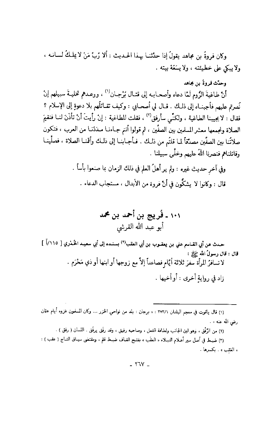 أبو عبد الله القرشي حدث عن أبي القاسم علي بن يعقوب بن أبي العقب بسنده إلى أبي سعيد الخدري قال: قال رسول الله صَلَّى اللهُ عَلَيْهِ وَسَلَّمَ: لا تسافر المرأى سفر ثلاثة أيامٍ فصاعداً إلا مع زوجها أو ابنها أو ذي محرم.