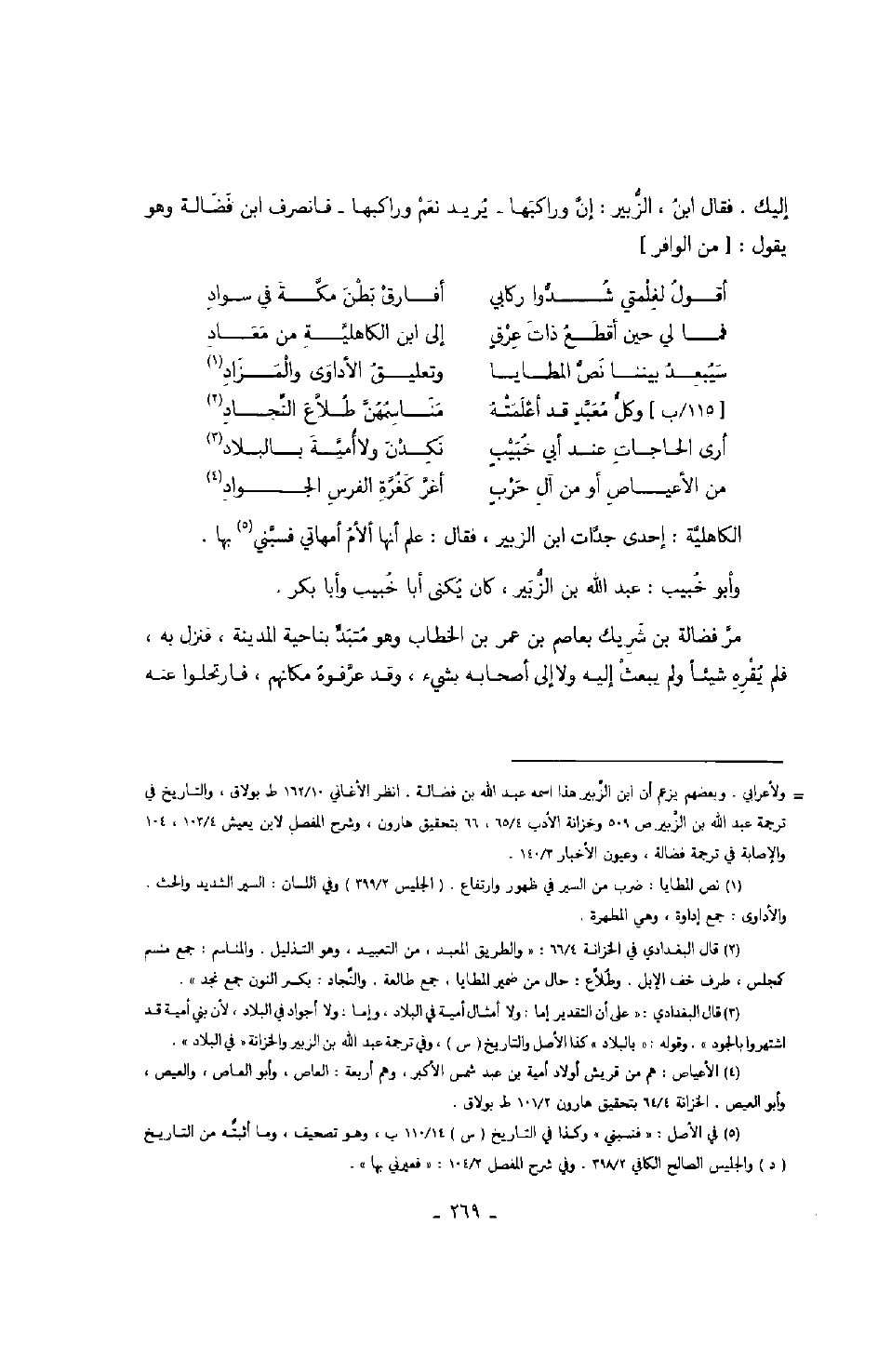 إليك. فقال ابن، الزبير: إن وراكبها - يريد نعم وراكبها - فانصرف ابن فضالة وهو يقول: من الوافر