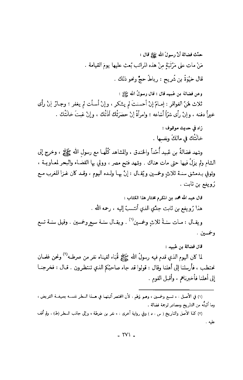 حدث فضالة أن رسول الله صَلَّى اللهُ عَلَيْهِ وَسَلَّمَ قال: من مات على مرتبةٍ من هذه المراتب بعث عليها يوم القيامة.