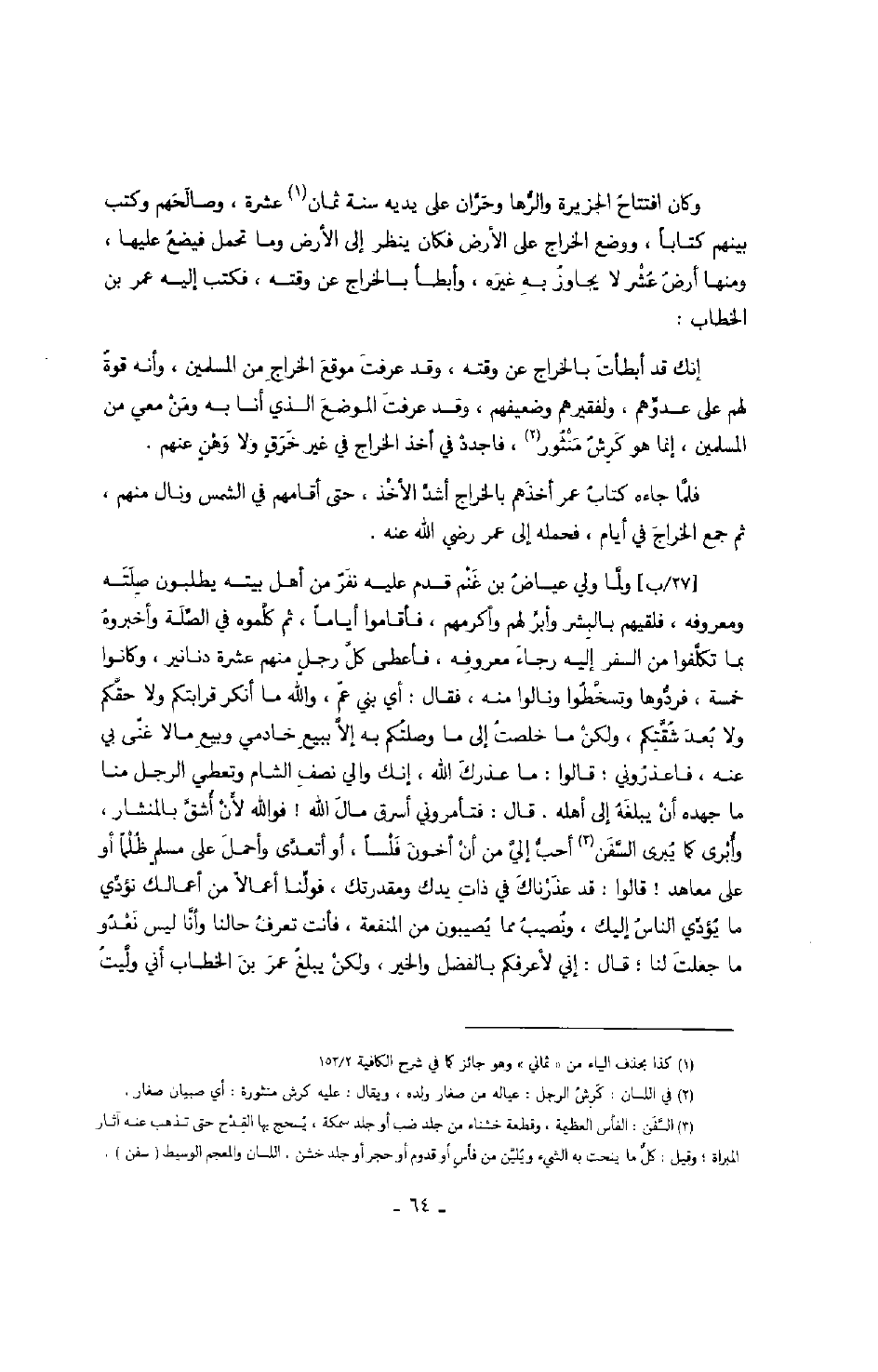 وكان افتتاح الجزيرة والرها وحران على يديه سنة ثمان عشرة، وصالحهم وكتب بينهم كتاباً، ووضع الخراج على الأرض فكان ينظر إلى الأرض وما تحمل فيضع عليها، ومنها أرض عشر لا يجاوز به غيره، وأبطأ بالخراج عن وقته، فكتب إليه عمر بن الخطاب: إنك قد أبطأت بالخراج عن وقته، وقد عرفت موقع الخراج من المسلمين، وأنه قوةٌ لهم على عدوهم، ولفقيرهم وضعيفهم، وقد عرفت الموضع الذي أنا به ومن معي من المسلمين، إنما هو كرش منثور، فاجدد في أخذ الخراج في غير خرقٍ ولا وهنٍ عنهم.