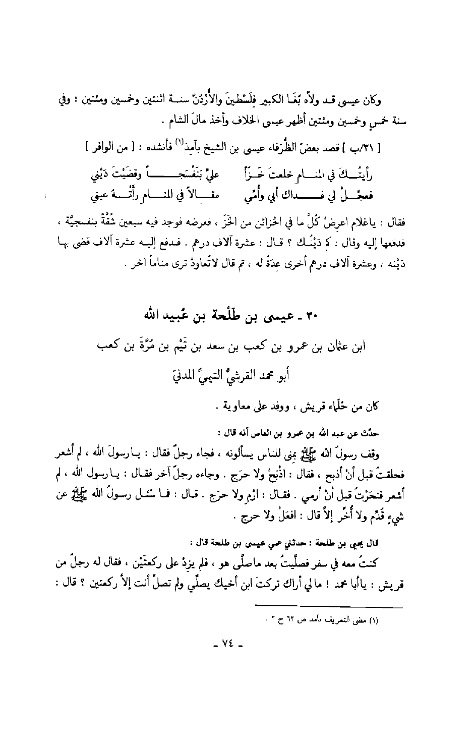 قال يحيى بن طلحة: حدثني عمي عيسى بن طلحة قال: كنت معه في سفر فصليت بعد ما صلى هو، فلم يزد على ركعتين، فقال له رجلٌ من قريش: يا أبا محمد! مالي أراك تركت ابن أخيك يصلي ولم تصل أنت إلا ركعتين؟ قال: