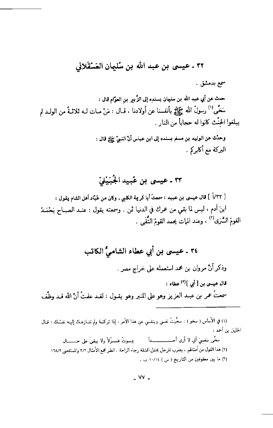 حدث عن أبي عبد الله بن سليمان بسنده إلى الزبير بن العوام قال: سخى رسول الله صَلَّى اللهُ عَلَيْهِ وَسَلَّمَ بأنفسنا عن أولادنا، قال: من مات له ثلاثةٌ من الولد لم يبلغوا الحنث كانوا له حجاباً من النار.