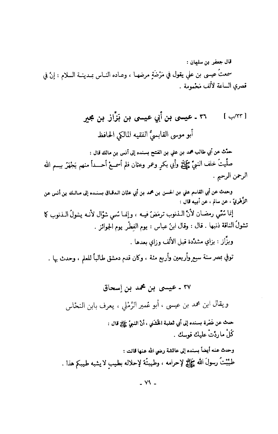 36 - عيسى بن أبي عبسى بن بزاز بن مجير أبو موسى القابسي الفقيه المالكي الحافظ حدث عن أبي طالب محمد بن علي بن الفتح بسنده إلى أنس بن مالك قال: صليت خلف النبي صَلَّى اللهُ عَلَيْهِ وَسَلَّمَ وأبي بكر وعمر وعثمان فلم أسمع أحداً منهم يجهر ببسم الله الرحمن الرحيم.