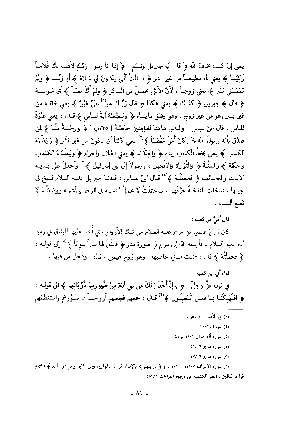 قال أبي بن كعب: كان روح عيسى بن مريم عليه السلام من تلك الأرواح التي أخذ عليها الميثاق في زمن آدم عليه السلام، فأرسله الله إلىمريم في صورة بشر " فتمثل لها بشراً سوياً " إلى قوله: " فحملته " قال: حملت الذي خاطبها، وهو روح عيسى، قال: ودخل من فيها.