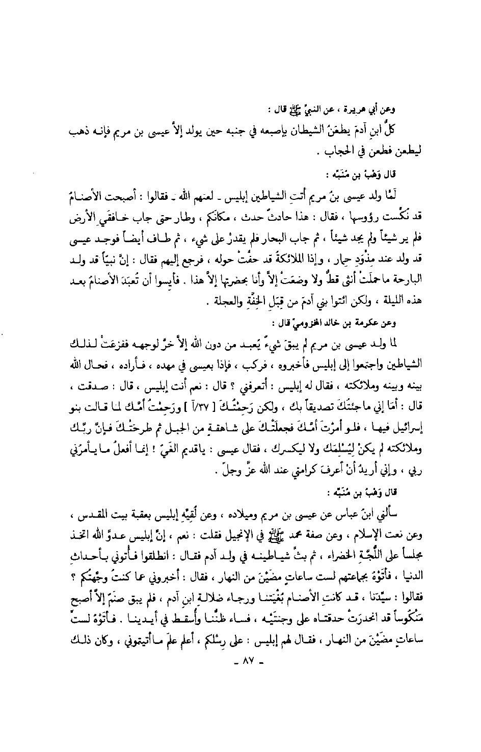 وعن أبي هريرة قال: عن النبي صَلَّى اللهُ عَلَيْهِ وَسَلَّمَ قال: كل ابن آدم يطعن الشيطان بإصبعه في جنبه حين يولد إلا عيسى بن مريم فإنه ذهب ليطعن فطعن في الحجاب.