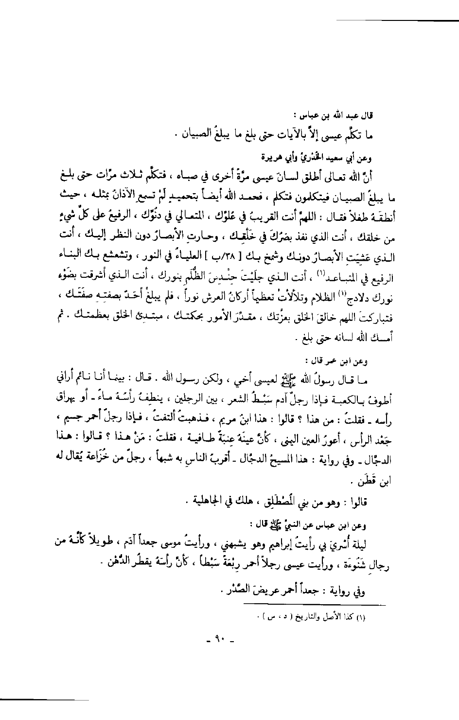 وعن ابن عمر قال: ما قال رسول الله صَلَّى اللهُ عَلَيْهِ وَسَلَّمَ لعيسى أخي، ولكن رسول الله. قال: بينما أنا نائم أراني أطوف بالكعبة فإذا رجلٌ آدم سبط الشعر، بين الرجلين، ينظف رأسه ماءٌ - أو يهراق رأسه - فقلت: من هذا؟ قالوا: هذا ابن مريم، فذهبت التفت، فإذا رجلٌ أحمر جسيم، جعد الرأس، أعور العين اليمنى، كأن عينه عنبةٌ طافية، فقلتك من هذا؟ قالوا: هذا الدجال - وفي رواية: هذا المسيح الدجال - أقرب الناس به شبهاً، رجلٌ من خزاعة يقال له ابن قطن.