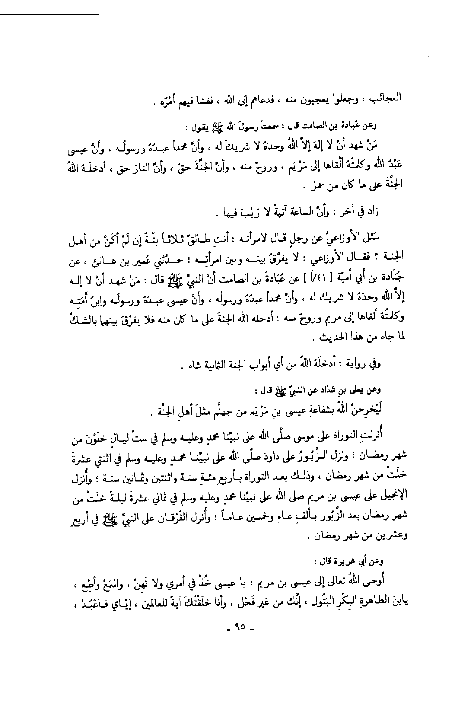 سئل الأوزاعي عن رجلٍ قال لامرأته: أنت طالقٌ ثلاثاً بتةً أن لم أكن من أهل الجنة؟ فقال الأوزاعي: لا يفرق بينه وبين امرأته؛ حدثني عمير بن هانئ، عن جنادة بن أبي أمية عن عبادة بن الصامت أن النبي صَلَّى اللهُ عَلَيْهِ وَسَلَّمَ قال: من شهد أن لا إله إلا الله وحده لا شريك له، وأن محمداً عبده ورسوله، وأن عيسى عبده ورسوله وابن أمته وكلمته ألقاها إلى مريم، وروحٌ منه، أدخله الله الجنة على ما كان منه فلا يفرق بينهما بالشك لما جاء من هذا الحديث.
