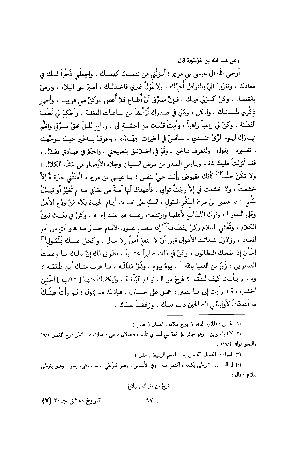 وعن عبد الله بن عوسجة قال: أوحى الله إلى عيسى بن مريم؛ أنزلني من نفسك كهمك، واجعلني ذخراً لك في معادك، وتقرب إلي بالنوافل أحبك، ولا تول غيري فأخذلك، اصبر على البلاء، وارضى بالقضاء، وكن كمسرتي فيك، فإن مسرتي أن أطاع فلا أعصى، وكن مني قريباً، وأحي ذكري بلسانك، ولتكن مودتي في صدره يقظ من ساعات الغفلة، واحكم لي لطف الفطنة، وكن لي راغباً راهباً، وأمت قلبك من الخشية لي، وراع الليل بحق مسرتي واظم نهارك ليوم الري عندي، نافس في الخيرات جهدك، واعرف بالخير حيث توجهت - تفسيره: يقول: ولتعرف بالخير - وقم في الخلائق بنصيحتي، واحكم في عبادي بعدك، فقد أنزلت عليك شفاء وساوس الصدر من مرض النسيان وجلاء الأبصار من غشا الكلال؛ ولا تكن حلساً كأنك مقبوض وأنت حيتنفس؛ ياعيسى بن مريم ما أمنتني خليقةٌ إلا خشعت، ولا خشعت لي إلا رجت ثوابي، فأشهدك أنها آمنةٌ من عقابي ما لم تغير أو تبدل سنتي؛ يا عيسى بن مريم البكر البتول، ابك على نفسك ايام الحياة بكاء من ودع الأهل وقلى الدنيا، وترك اللذات لأهلها وارتفعت رغبته فيما عند إلهه، وكن في ذلك تلين الكلام، وتفشي السلام وكن يقظانا إذا نامت عيون الأنام حذار ما هو آتٍ من أمر المعاد، وزلازل شدائد الأهوال قبل أن لا ينفع أهلٌ ولا مال، واكحل عينك بملمول الحزن إذا ضحك البطالون، وكن في ذلك صابراً محتسباً، فطوبى لك إن نالك ما وعدت الصابرين، زج من الدنيا بالله، يوم بيوم، وذق مذاقه، ما هرب منك أين طعمه؟ وما لم يأتك كيف لذته؟ فزج من الدنيا بالبلغة، وليكفك منها الخشن الخشب، قد رأيت إلى ما تصير؛ اعمل على حساب، فإنك مسؤول؛ لو رات عينك ما أعددت لأوليائي الصالحين ذاب قلبك، وزهقت نفسك.