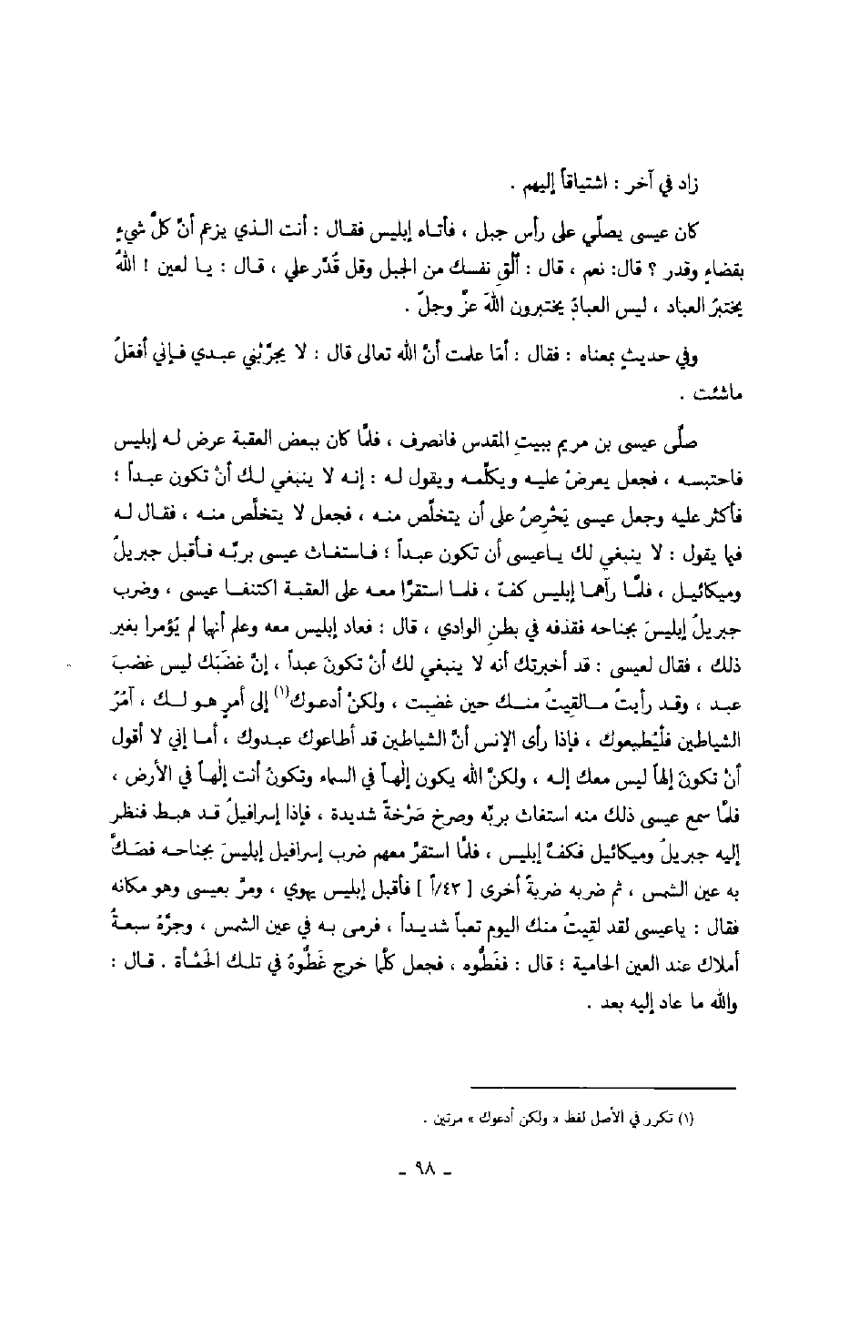 صلى عيسى بن مريم ببيت المقدس فانصرف، فلما كان ببعض العقبة عرض له إبليس فاحتبسه، فجعل يعرض عليه ويكلمه ويقول له: إنه لا ينبغي لك أن تكون عبداً؛ فأكثر عليه وجعل عيسى يحرص على أن يتخلص منه، فجعل لا يتخلص منه، فقال له فيما يقول: لا ينبغي لك يا عيسى أن تكون عبداً؛ فاستغاث عيسى بربه فأقبل جبريل وميكائيل، فلما رآهما إبليس كف، فلما استقرا معه العقبة اكتنفا عيسى، وضرب جبريل إبليس بجناحه فقذفه في بطن الوادي، قال: فعاد إبليس معه وعلم أنهما لم يؤمرا بغير ذلك، فقال لعيسى: قد أخبرتك أنه لاينبغي لك أن تكون عبداً، إن غضبك ليس غضب عبد، وقد رأيت ما لقيت منك حين غضبت، ولكن أدعوك إلى أمرٍ هو لك، آمر الشياطين فليطيعوك، فإذا رأى الإنس أن الشياطين قد أطاعوك عبدوك، أما إني لا أقول أن تكون إلهاً ليس معك إله، ولكن الله يكون إلهاً في السماء وتكون أنت إلهاً في الأرض، فلما سمع عيسى ذلك منه استغاث بربه وصرخ صرخةق شديدة، فإذا إسرافيل قد هبط فنظر إليه جبريل وميكائيل فكف إبليس، فلما استقر معهم ضرب إسرافيل إبليس بجناحه فصك به عين الشمس، ثم ضربه ضربة اخرى فأقبل إبليس يهوي، ومر بعيسى وهو مكانه فقال: يا عيسى لقد لقيت منك اليوم تعباً شديداً، فرمى به في عين الشمس، وجره سبعة أملاك عند العين الحامية؛ قال: فغطوه، فجعل كلما خرج غطوه في تلك الحمأة. قال: والله ما عاد إليه بعد.