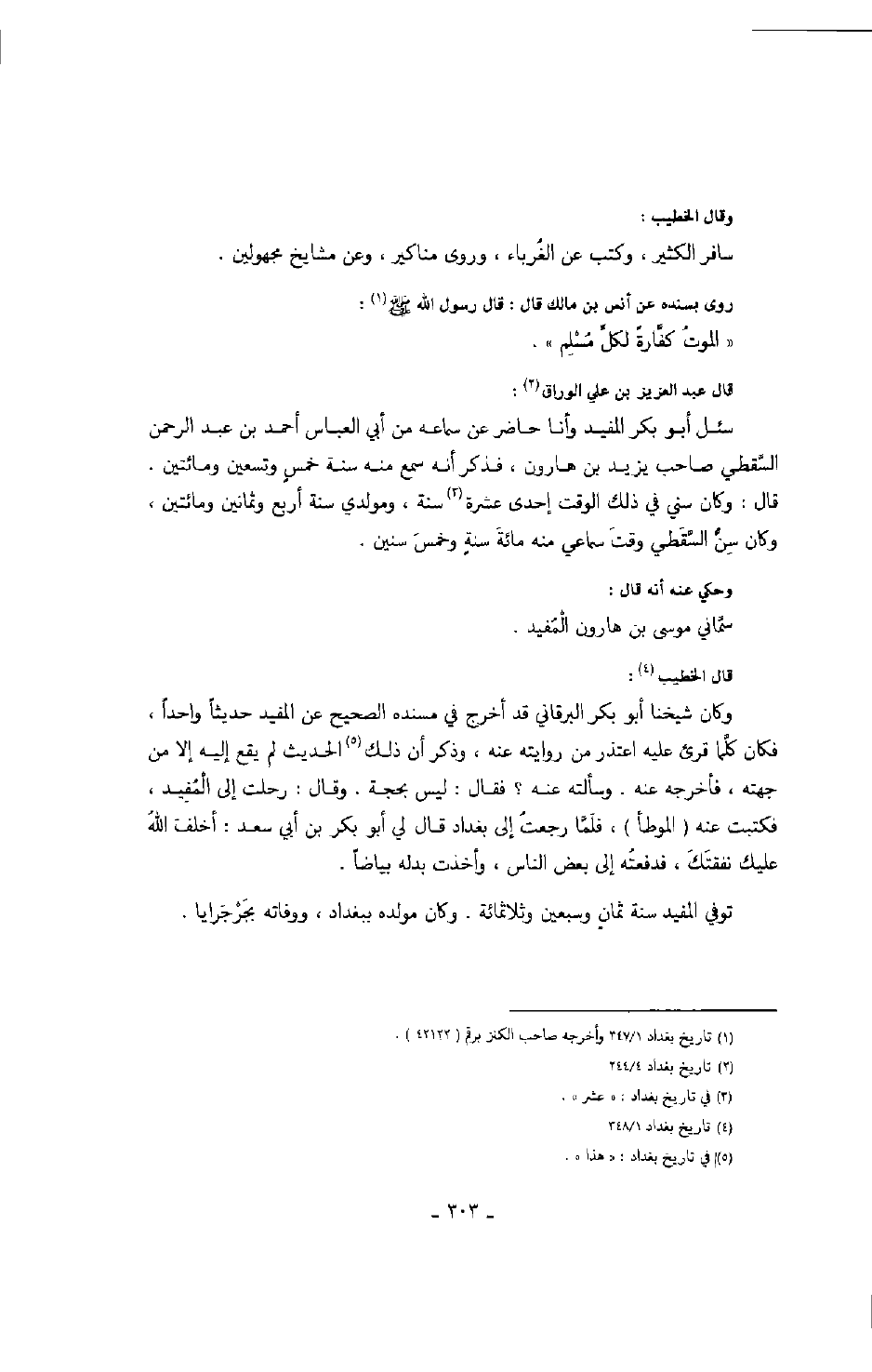 وحكي عنه أنه قال: قال الخطيب: وكان شيخنا أبو بكر البرقاني قد أخرج في مسنده الصحيح عن المفيد حديثاً واحداً، فكان كلما قرئ عليه اعتذر من روايته عنه، وذكر أن ذلك الحديث لم يقع إليه إلا من جهته، فأخرجه عنه. وسألته عنه؟ فقال: ليس بحجة. وقال: رحلت إلى المفيد، فكتبت عنه " الموطأ "، فلما رجعت إلى بغداد قال لي أبو بكر بن أبي سعد: أخلف الله عليك نفقتك، فدفعته إلى بعض الناس، وأخذت بدله بياضاً.