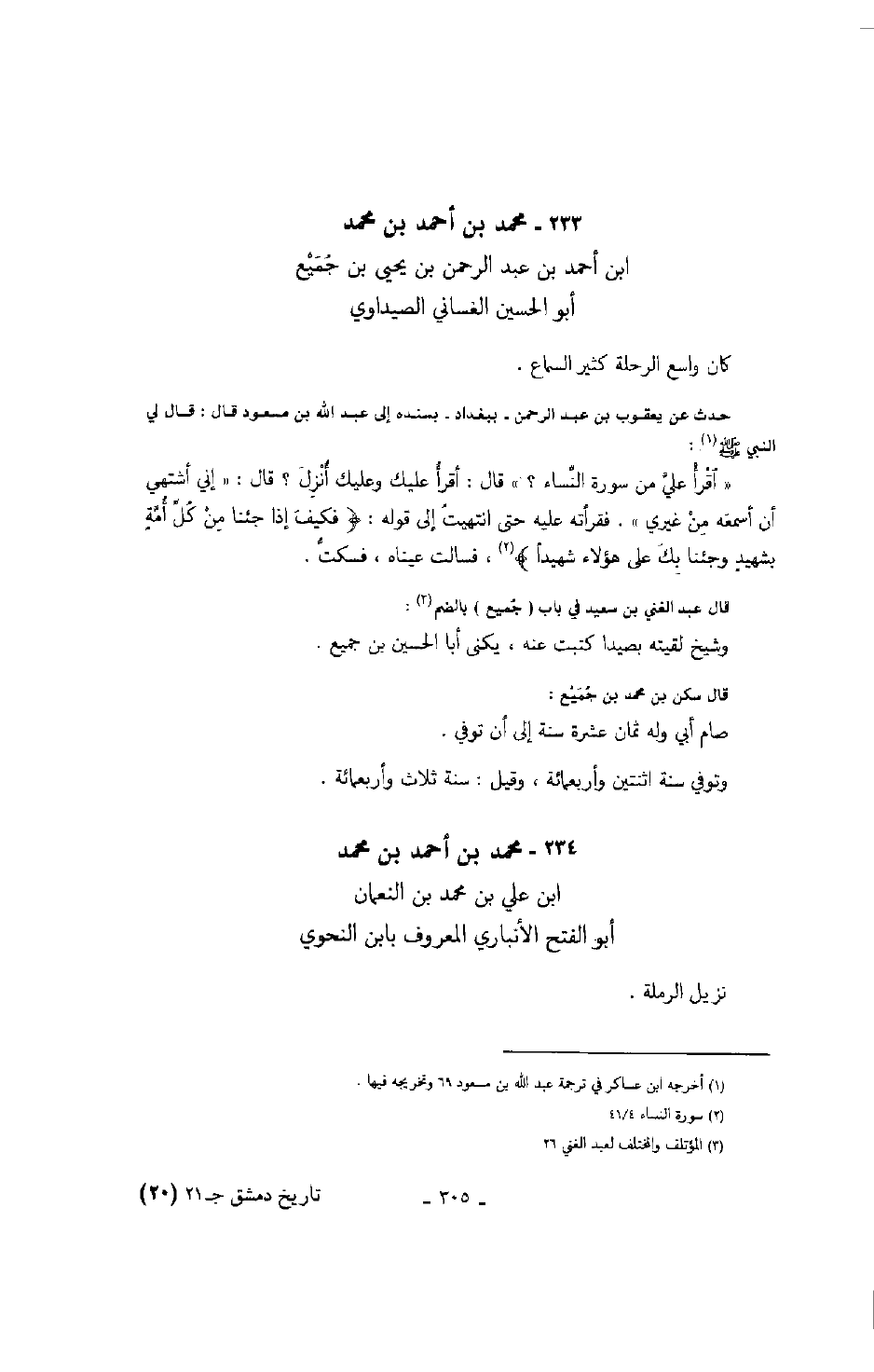 حدث عن يعقوب بن عبد الرحمن - ببغداد - بسنده إلى عبد الله بن مسعود قال: قال لي النبي صَلَّى اللهُ عَلَيْهِ وَسَلَّمَ: " اقرأ علي من سورة النساء؟ " قال: أقرأ عليك وعليك أنزل؟ قال: " إني أشتهي أن أسمعه من غيري ". فقرأته عليه حتى انتهيت إلى قوله: " فكيف إذا جئنا من كل أمة بشهيد وجئنا بك على هؤلاء شهيداً "، فسالت عيناه، فسكت.