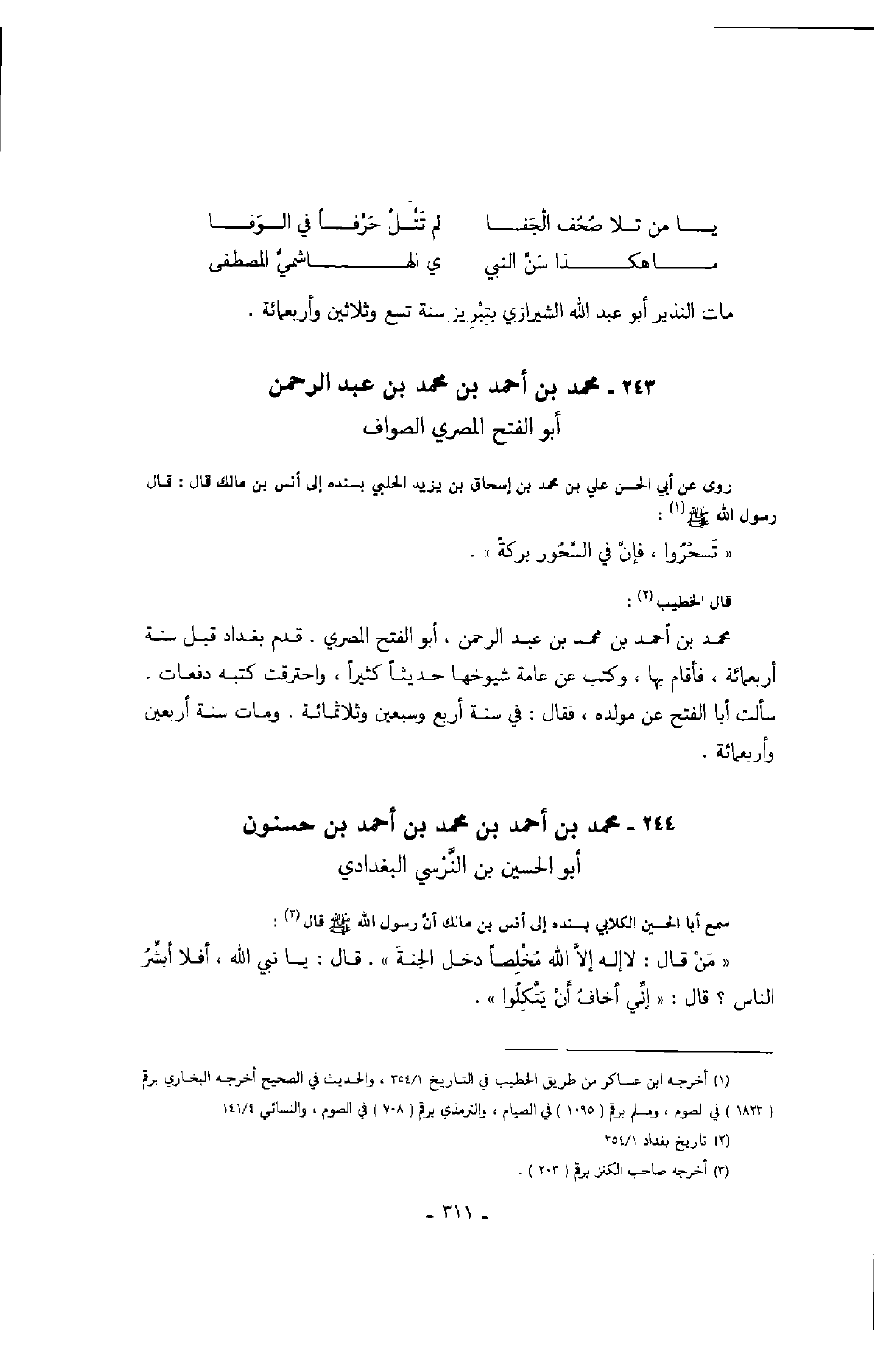 ابن عبد الرحمن أبو الفتح المصري الصواف روى عن أبي الحسن علي بن محمد بن إسحاق بن يزيد الحلبي بسنده إلى أنس بن مالك قال: قال رسول الله صَلَّى اللهُ عَلَيْهِ وَسَلَّمَ: " تسحروا، فإن في السحور بركة ".