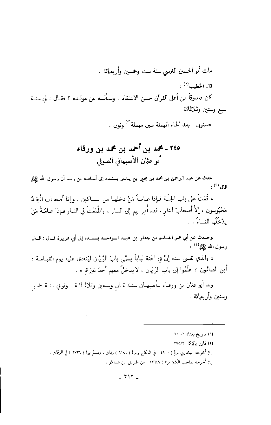 أبو عثمان الأصبهاني الصوفي حدث عن عبد الرحمن بن محمد بن يحيى بن ياسر بسنده إلى أسامة بن زيد لأن رسول الله صَلَّى اللهُ عَلَيْهِ وَسَلَّمَ قال: " قمت على باب الجنة فإذا عامة من دخلها من المساكين، وإذا أصحاب الجد محبوسون، إلا أصحاب النار، فقد أمر بهم إلى النار، واطلعت في النار فإذا عامة من يدخلها من النساء ".
