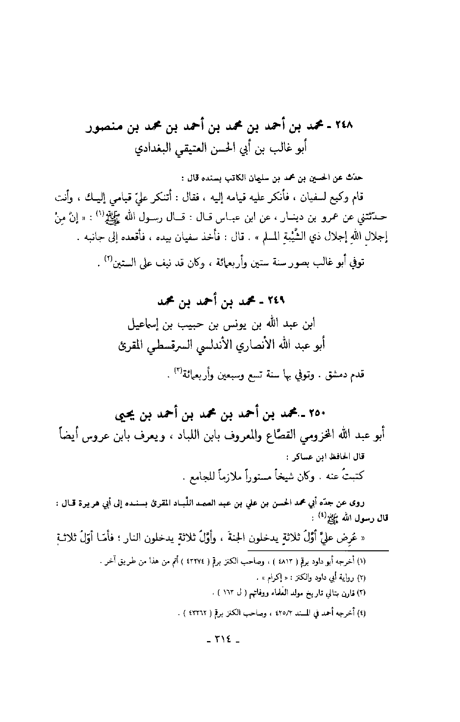 روى عن جده أبي محمد الحسن بن علي بن عبد الصمد اللباد المقرئ بسنده إلى أبي هريرة: قال رسول الله صَلَّى اللهُ عَلَيْهِ وَسَلَّمَ: " عرض علي أول ثلاثة يدخلون الجنة، وأول ثلاثة يدخلون النار؛ فأما أول ثلاثة