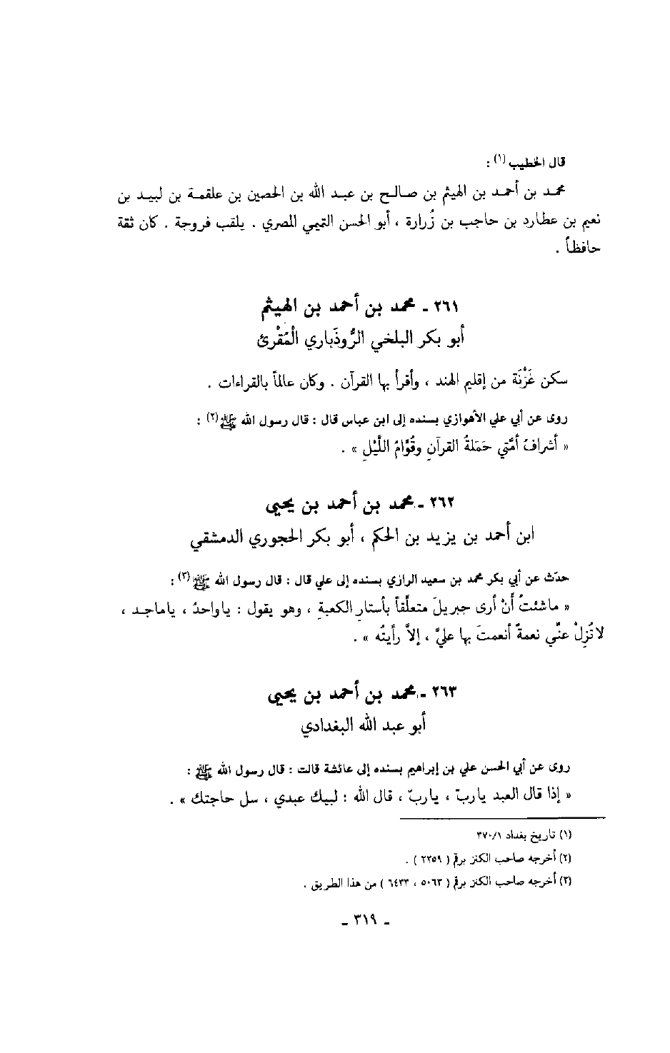 أبو عبد الله البغدادي روى عن أبي الحسن علي بن إبراهيم بسنده إلى عائشة قالت: قال رسول الله صَلَّى اللهُ عَلَيْهِ وَسَلَّمَ: " إذا قال العبد يا رب، يا رب، قال الله: لبيك عبدي، سل حاجتك ".