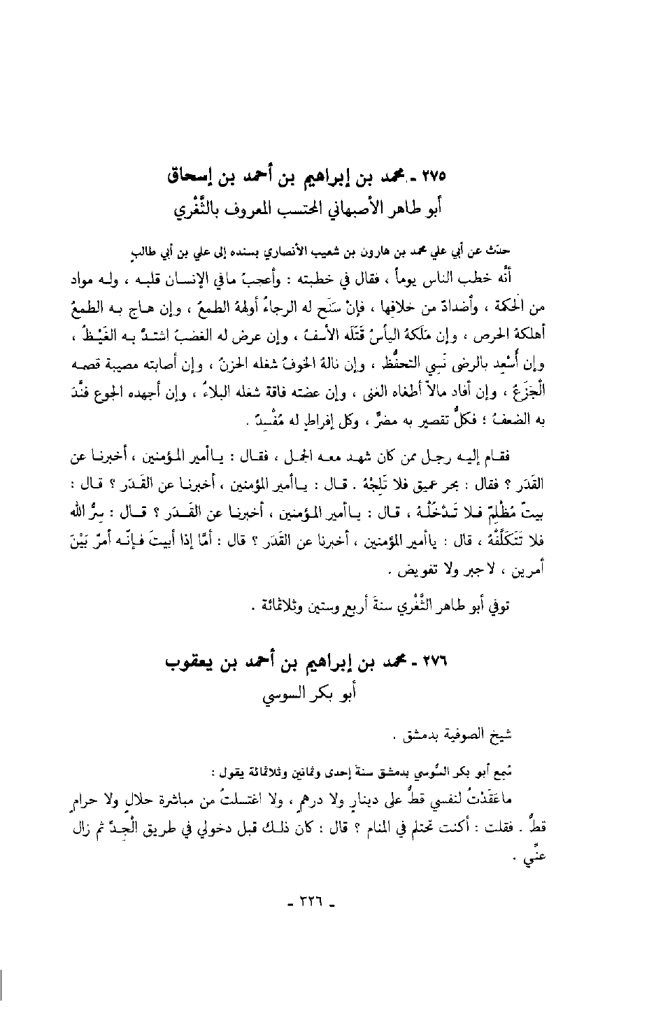 ابن إسحاق أبو طاهر الأصبهاني المحتسب المعروف بالثغري حدث عن أبي علي محمد بن هارون بن شعيب الأنصاري بسنده إلى علي بن أبي طالب أنه خطب الناس يوماً، فقال في خطبته: وأعجب ما في الإنسان قلبه، وله مواد من الحكمة، وأضداد من خلافها، فإن سنح له الرجاء أولهه الطمع، وإن هاج به الطمع أهلكه الحرص، وإن ملكه اليأس قتله الأسف، وإن عرض له الغضب اشتد به الغيظ، وإن أسعد بالرضى نسي التحفظ، وإن ناله الخوف شغله الحزن، وأن أصابته مصيبة قصمه الجزع، وإن أفاد مالاً أطغاه الغنى، وإن عضته فاقة شغله البلاء، وإن أجهده الجوع فند به الضعف؛ فكل تقصير به مضر، وكل إفراط له مفسد.