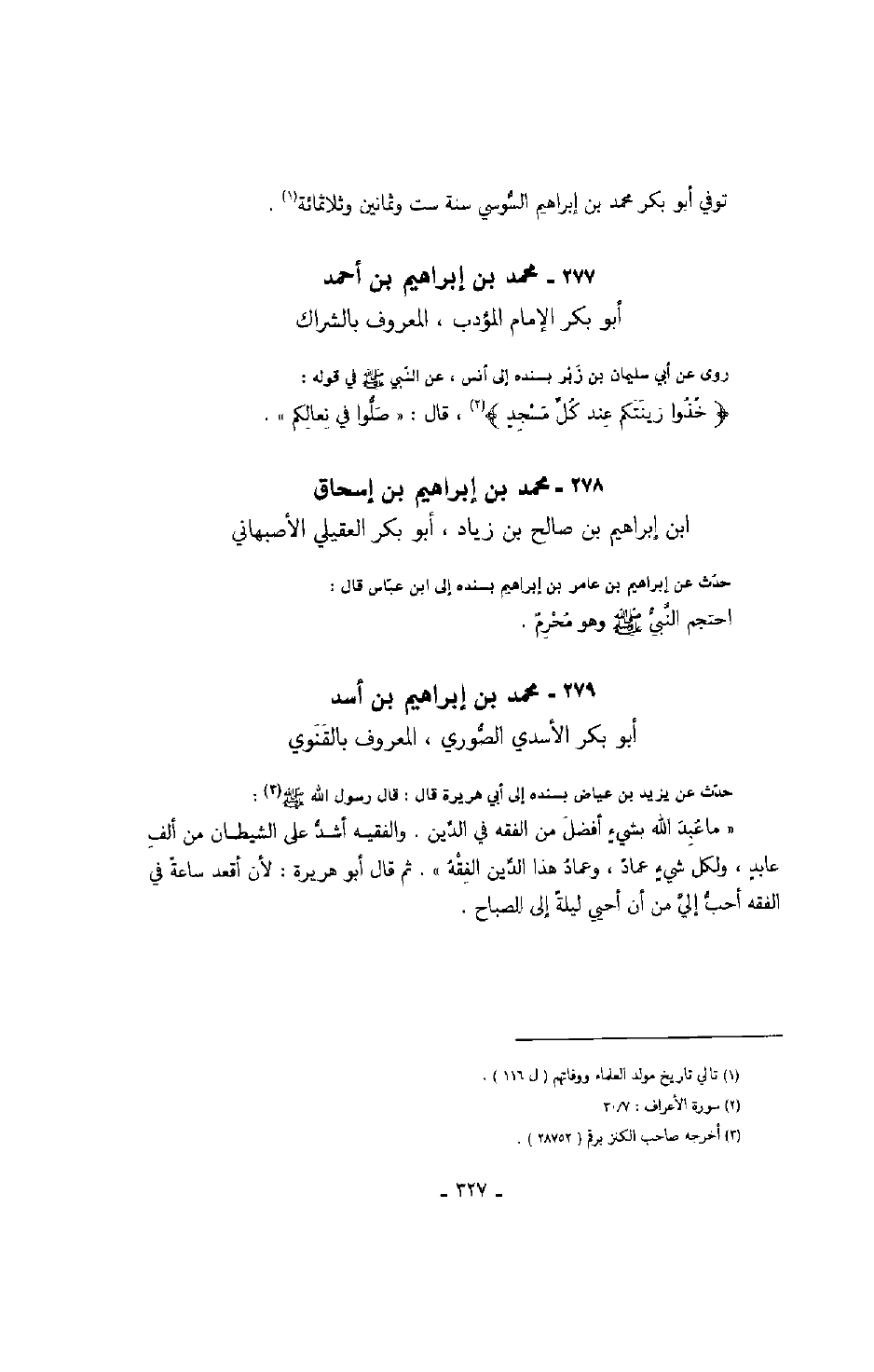 أبو بكر الإمام المؤدب، المعروف بالشراك روى عن أبي سليمان بن زبر بسنده إلى أنس، عن النبي صَلَّى اللهُ عَلَيْهِ وَسَلَّمَ في قوله: " خذوا زينتكم عند كل مسجد "، قال: " صلوا في نعالكم ".