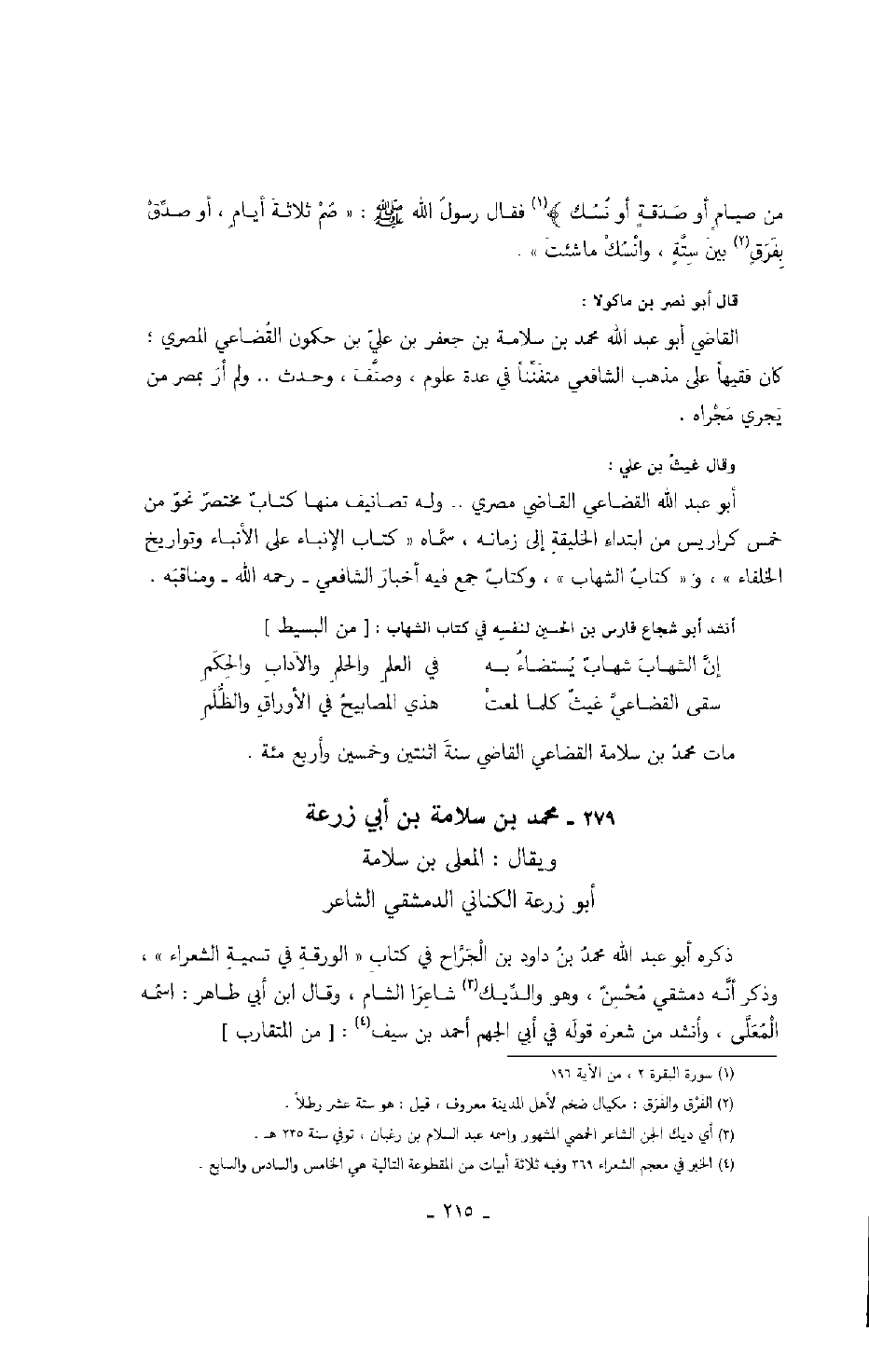 قال أبو نصر بن ماكولا: القاضي أبو عبد الله محمد بن سلامة بن جعفر بن علي بن حكمون القضاعي المصري؛ كان فقيهاً على مذهب الشافعي متفنناً في عدة علوم، وصنف، وحدث.. ولم أر بمصر من يجري مجراه.