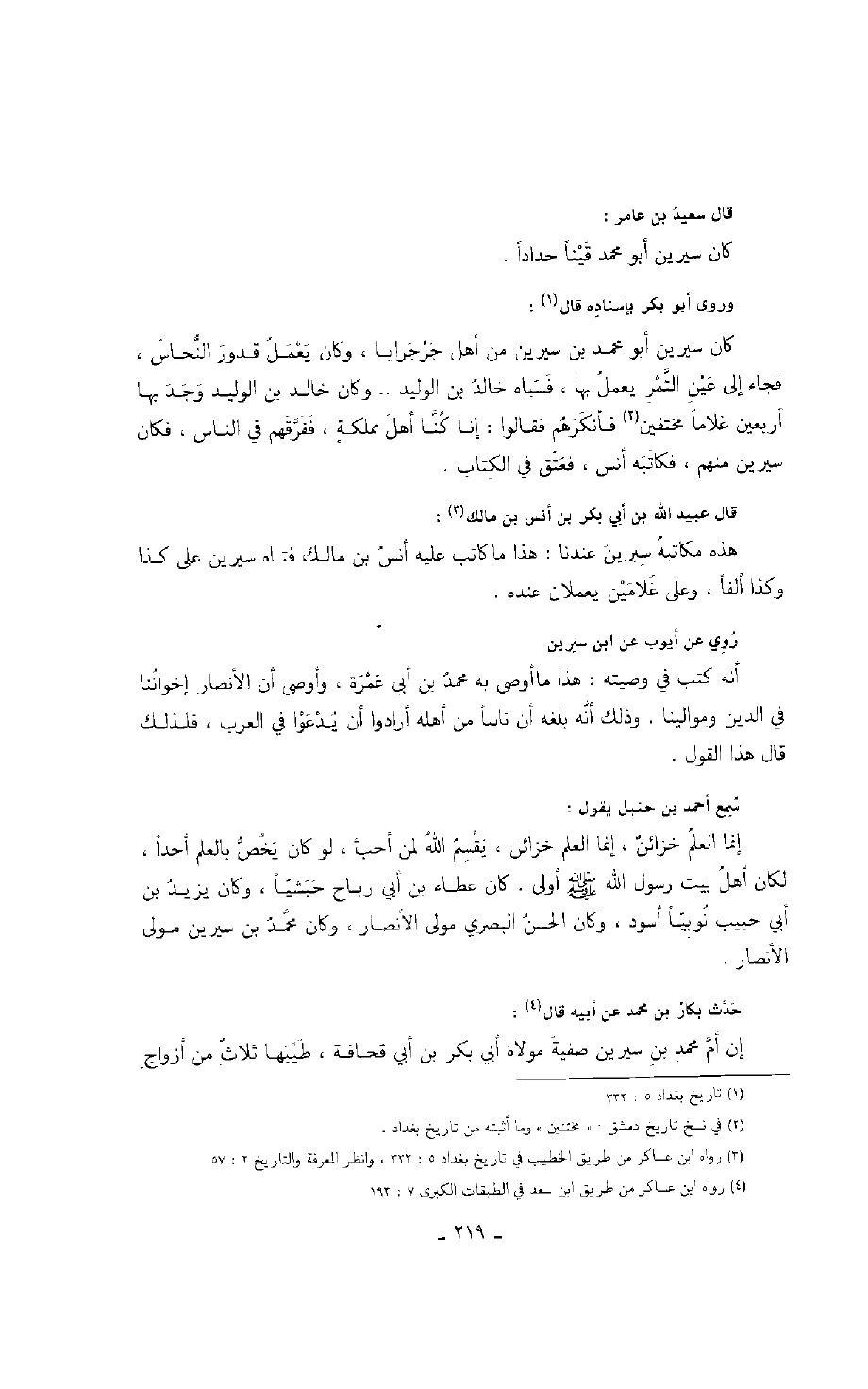 سمع أحمد بن حنبل يقول: إنما العلم خزائن، إنما العلم خزائن، يقسم الله لمن أحب، لو كان يخص بالعلم أحداً، لكان أهل بيت رسول الله صَلَّى اللهُ عَلَيْهِ وَسَلَّمَ أولى. كان عطاء بن أبي رباح حبشياً، وكان يزيد بن أبي حبيب نوبياً أسود، وكان الحسن البصري مولى الأنصار، وكان محمد بن سيرين مولى الأنصار.