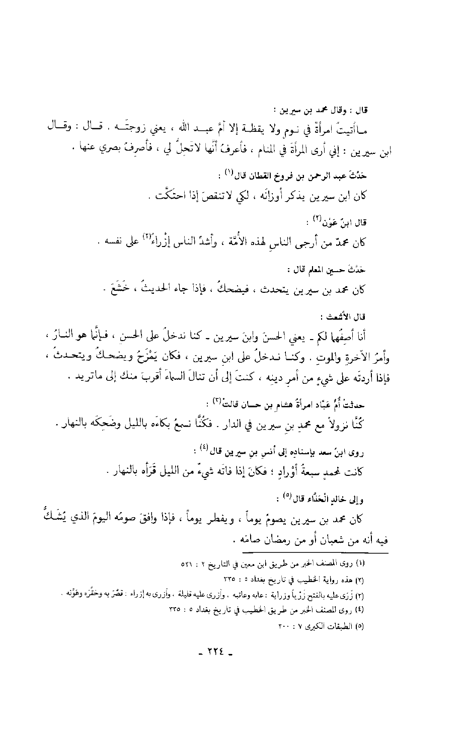 قال: وقال محمد بن سيرين: ما أتيت امرأة في نوم ولا يقظة إلا أم عبد الله، يعني زوجته. قال: وقال ابن سيرين: إني أرى المرأة في المنام، فأعرف أنها لا تحل لي، فأصرف بصري عنها.