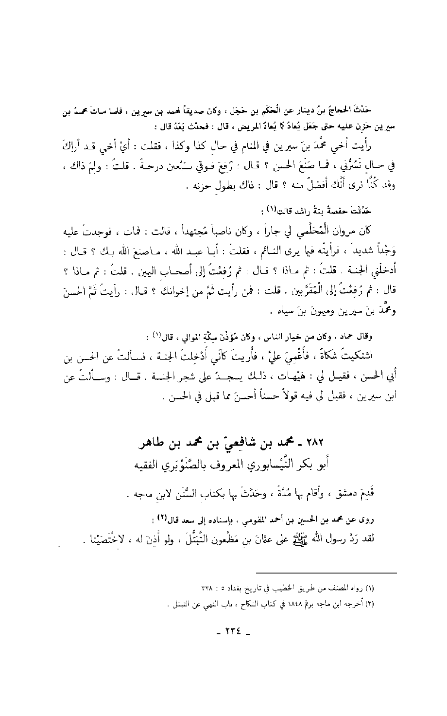 حدث الحجاج بن دينار عن الحكم بن حجل، وكان صديقاً لمحمد بن سيرين، فلما مات محمد بن سيرين حزن عليه حتى جعل يعاد كما يعاد المريض، قال: فحدث بعد قال: رأيت أخي محمد بن سيرين في المنام في حال كذا وكذا، فقلت: أي أخي قد أراك في حال تسرني، فما صنع الحسن؟ قال: رفع فوقي بسبعين درجة. قلت: ولم ذاك، وقد كنا نرى أنك أفضل منه؟ قال: ذاك بطول حزنه.