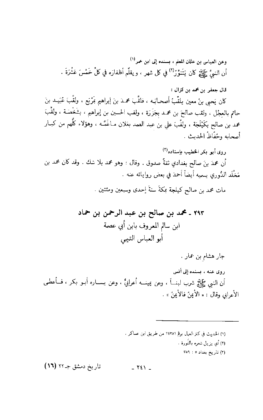 وعن العباس بن عثمان المعلم، بسنده إلى ابن عمر أن النبي صَلَّى اللهُ عَلَيْهِ وَسَلَّمَ كان يتنور في كل شهر، ويقلم أظفاره في كل خمس عشرة.