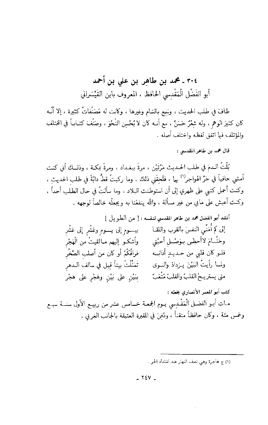 أبو الفضل المقدسي الحافظ، المعروف بابن القيسراني طاف في طلب الحديث، وسمع بالشام وغيرها، وكانت له مصنفات كثيرة، إلا أنه كان كثير الوهم، وله شعر حسن، مع أنه كان لا يحسن النحو، وصنف كتاباً في المختلف والمؤتلف فيما اتفق لفظه واختلف أصله.