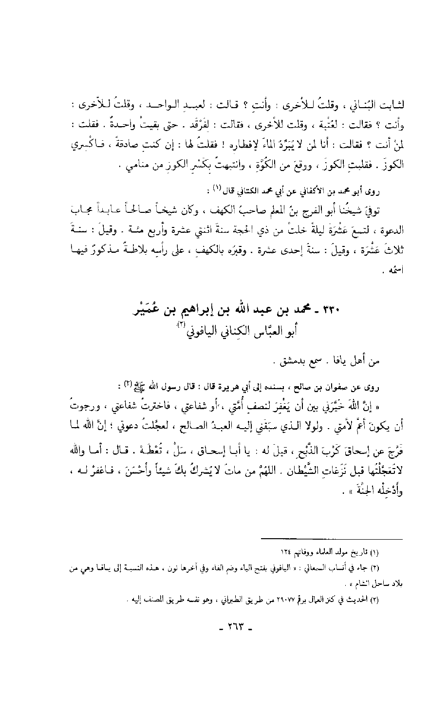 روى عن صفوان بن صالح، بسنده إلى أبي هريرة قال: قال رسول الله صَلَّى اللهُ عَلَيْهِ وَسَلَّمَ: " إن الله خيرني بين أن يغفر لنصف أمتي، أو شفاعتي، فاخترت شفاعتي، ورجوت أن يكون أعم لأمتي. ولولا الذي سبقني إليه العبد الصالح، لعجلت دعوتي؛ إن الله لما فرج عن إسحاق كرب الذبح، قيل له: يا أبا إسحاق، سل، تعطه. قال: أما والله لا تعجلتها قبل نزغات الشيطان. اللهم من مات لا يشرك بك شيئاً وأحسن، فاغفر له، وأدخله الجنة ".