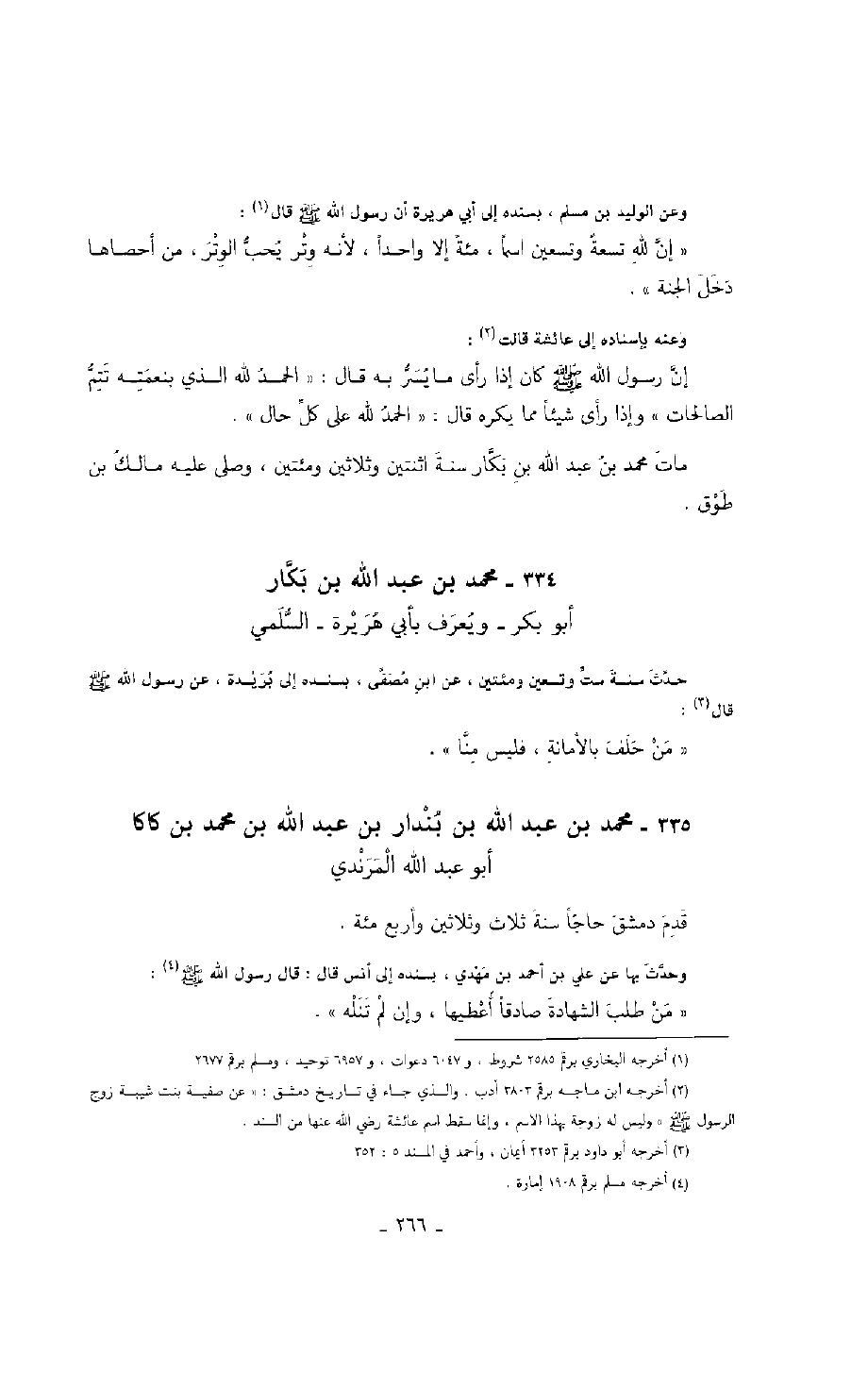 وعن الوليد بن مسلم، بسنده إلى أبي هريرة أن رسول الله صَلَّى اللهُ عَلَيْهِ وَسَلَّمَ قال: " إن لله تسعة وتسعين اسماً، مئة إلا واحداً، لأنه وتر يحب الوتر، من أحصاها دخل الجنة ".